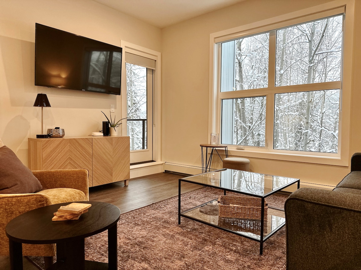 Velkommen til «Place in the Pines». Du vil bli behandlet med ditt eget private boblebad mens du nyter fjellutsikten på en romslig terrasse. Sove på helt nye madrasser, sove seks komfortabelt. Denne splitter nye enheten har en koselig elektrisk peis, lokal kunst og kaffe og komfortabel topp finish. Oppbevaring er inkludert for sykler og skiutstyr, sammen med én oppvarmet underjordisk parkeringsplass. Vaskemaskin/tørketrommel i full størrelse. Kom og nyt snøen og solen!