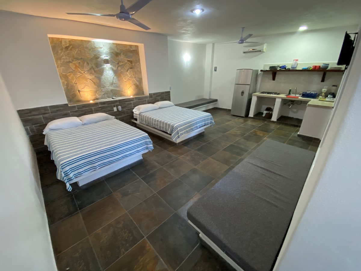 Denne romslige luksusleiligheten på 100 kvadratmeter helt privat og uavhengig som et vanlig hus ligger ett kvartal fra den vakre stranden i guayabitos,komfortabel,romslig og utstyrt med alt du trenger for å hvile og slappe av med roen i boligområdet, det har også et basseng og solsenger for å nyte klimaet i regionen,med en hage og grill for din stekt kjøtt og installasjon for å sette hengekøyen.