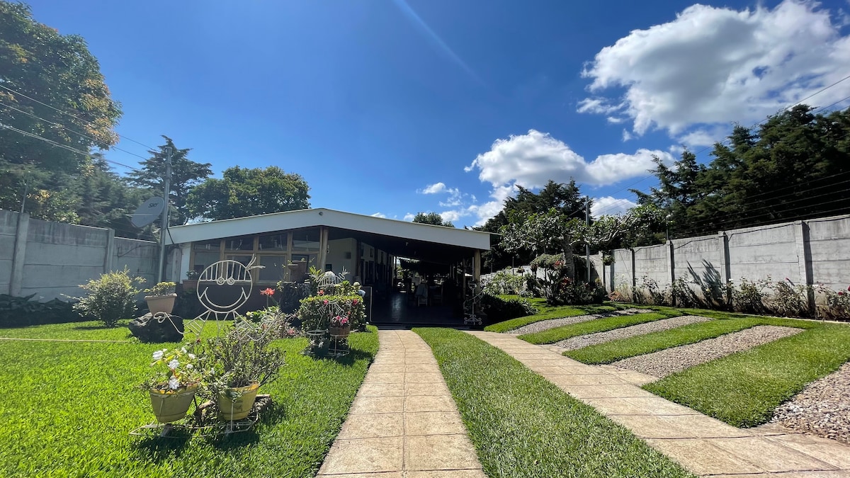 Slapp av med familien i dette vakre, rolige og koselige tilfluktsstedet, og tilbyr et behagelig klima, frodige hager og fantastisk utsikt over fjellkjeden Apaneca. Huset er fullt utstyrt og har et hovedsoverom med en queensize-seng, pluss to ekstra soverom, hvert med to enkeltsenger som gir rikelig plass til opptil seks gjester. Hjemmet er innredet med kjøkken, kjøleskap, kaffemaskin og mange andre fasiliteter, inkludert TV og Starlink Internett.