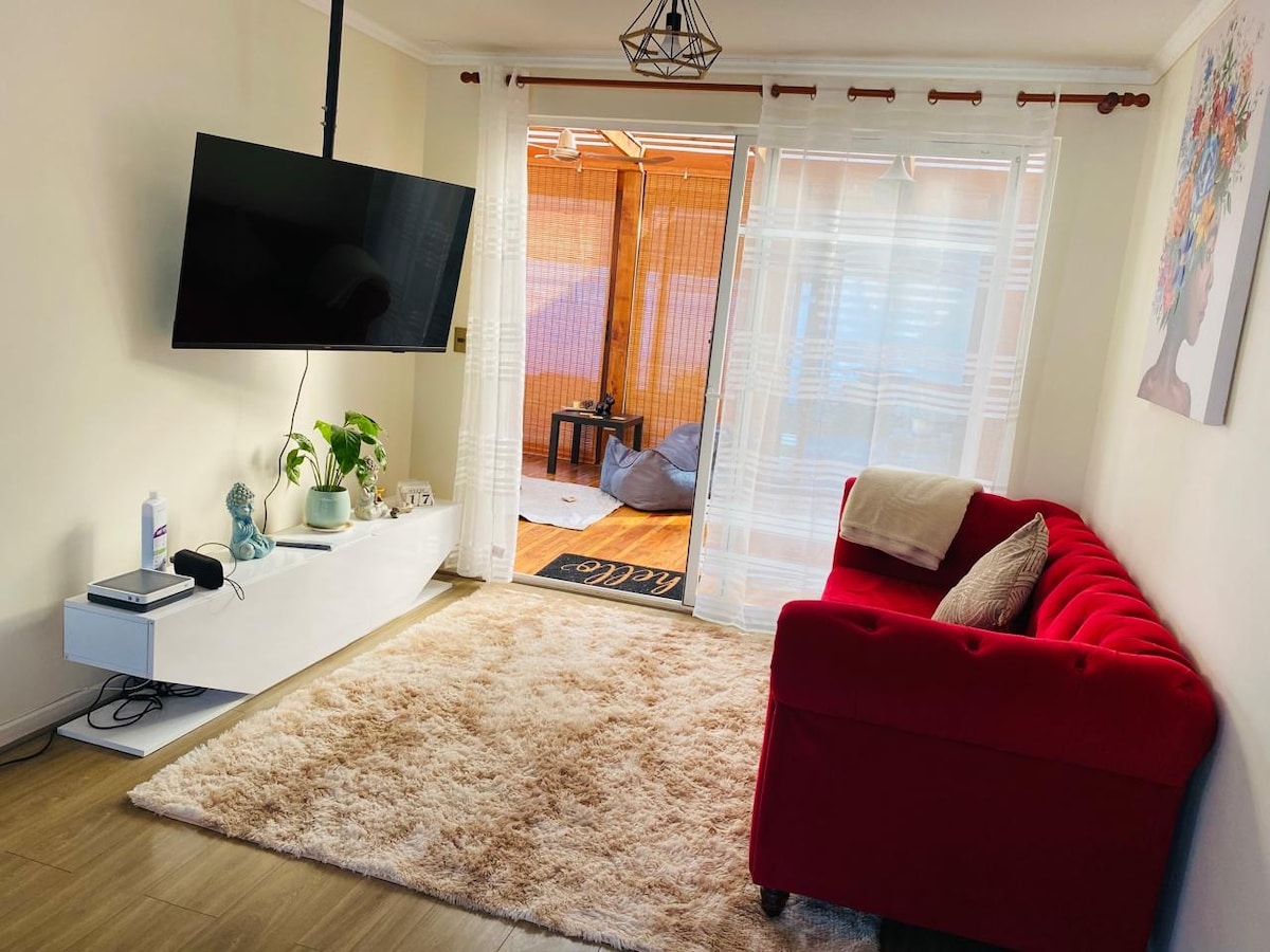 Utmerket leilighet med vakker utsikt over tre bakverkslagune, foran Universidad San Sebastián og få skritt fra sentrum av Concepción-området. Fullt utstyrt med 2-seters seng, smart-TV, trådløst nettverk, skrivebord og sovesofa i stuen med plass til opptil tre personer. Amerikansk kjøkken med stekeovn, brennere, servise, kjøkkenutstyr, vannkoker. Bad med alt innebygd utstyr (håndklær, såpe, sjampo).