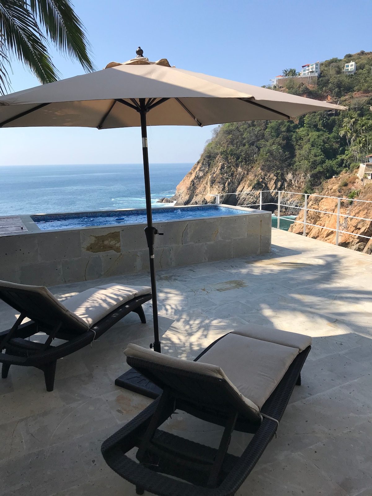Fullstendig renovert etter Otis: nydelig hvit villa i avslappet strandstil med meksikanske håndverksdetaljer. Privat basseng, tre soverom med klimaanlegg, to studioer, stue og spisestue, alle med full utsikt over Stillehavet. Ankomst med bil anbefales på det sterkeste, to parkeringsplasser tilgjengelig. Klubbhus med stort basseng, badstue, treningsstudio. Rengjøring er inkludert, matlagingstjeneste er tilgjengelig på forespørsel. Sikkerhet døgnet rundt. Løpe-/gåvei tilgjengelig gjennom Brisas, med utsikt over Acapulco-bukten.