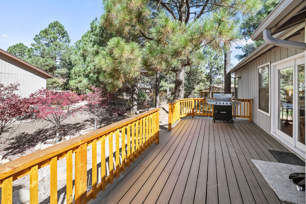 Nybygd tømmerhytte med badekar (vær oppmerksom på at badekaret er litt høyere enn vanlig og kan være utfordrende for eldre eller personer med bevegelsesvansker), loft og alle fasiliteter. Nyt din private panoramautsikt over skogen og San Francisco Peaks fra din overbygde veranda. Hvelvet tak, kingsize-seng på soverommet, futon-sofa/seng i stuen og futon-seng i full størrelse på loftet. Kjæledyret ditt er alltid velkommen her. Bare fem minutter unna I-40 for enkel tilgang.