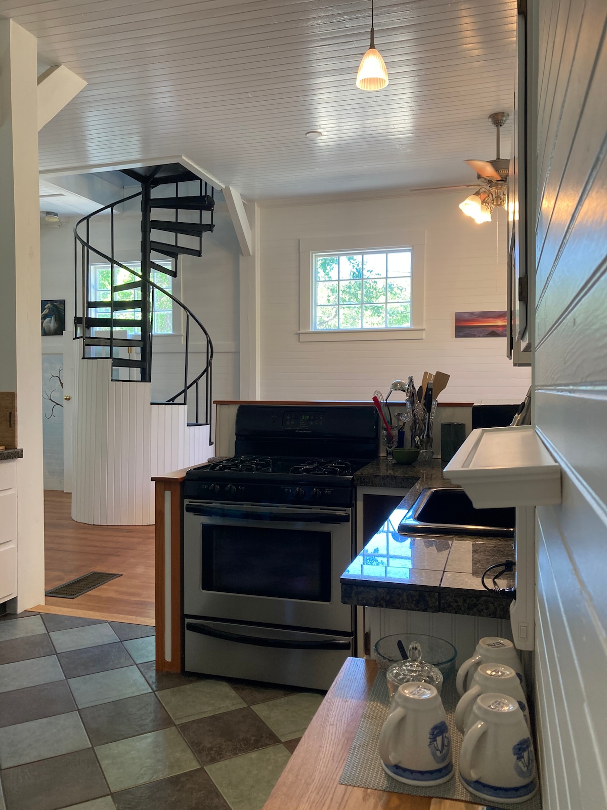 The Boathouse was a part of the Manomet Coast Guard Station on Manomet Point. When the station was decommissioned and eventually dismantled, the Boathouse was moved and attached to our home as a separate space. Guests will have full and private access to this beautiful and spacious 1,800 square foot home with 11 foot vaulted ceilings and antique southern exposure windows. The open first floor has a living room, kitchen, pool table and bathroom. A spiral staircase leads to the bedroom.