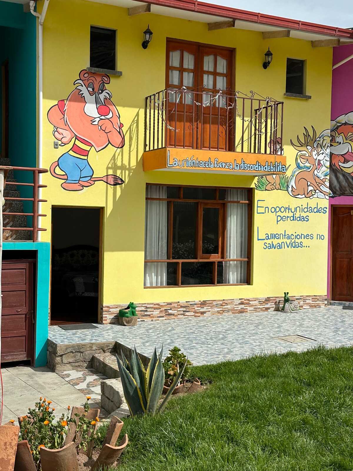 SPANSK: Huset vårt har godt opplyste rom med en spektakulær utsikt over Titicaca-sjøen, et utstyrt kjøkken med utsikt over hagen, en hyggelig stue for å hvile og nyte atmosfæren og en vakker gårdsplass full av blomster for å nyte ettermiddagssolen. ENGELSK: Huset vårt har de beste rommene i byen virkelig godt opplyst med en fantastisk utsikt over Titicaca-sjøen, et utstyrt kjøkken med utsikt over hagen vår, en koselig stue og en vakker hage full av blomster