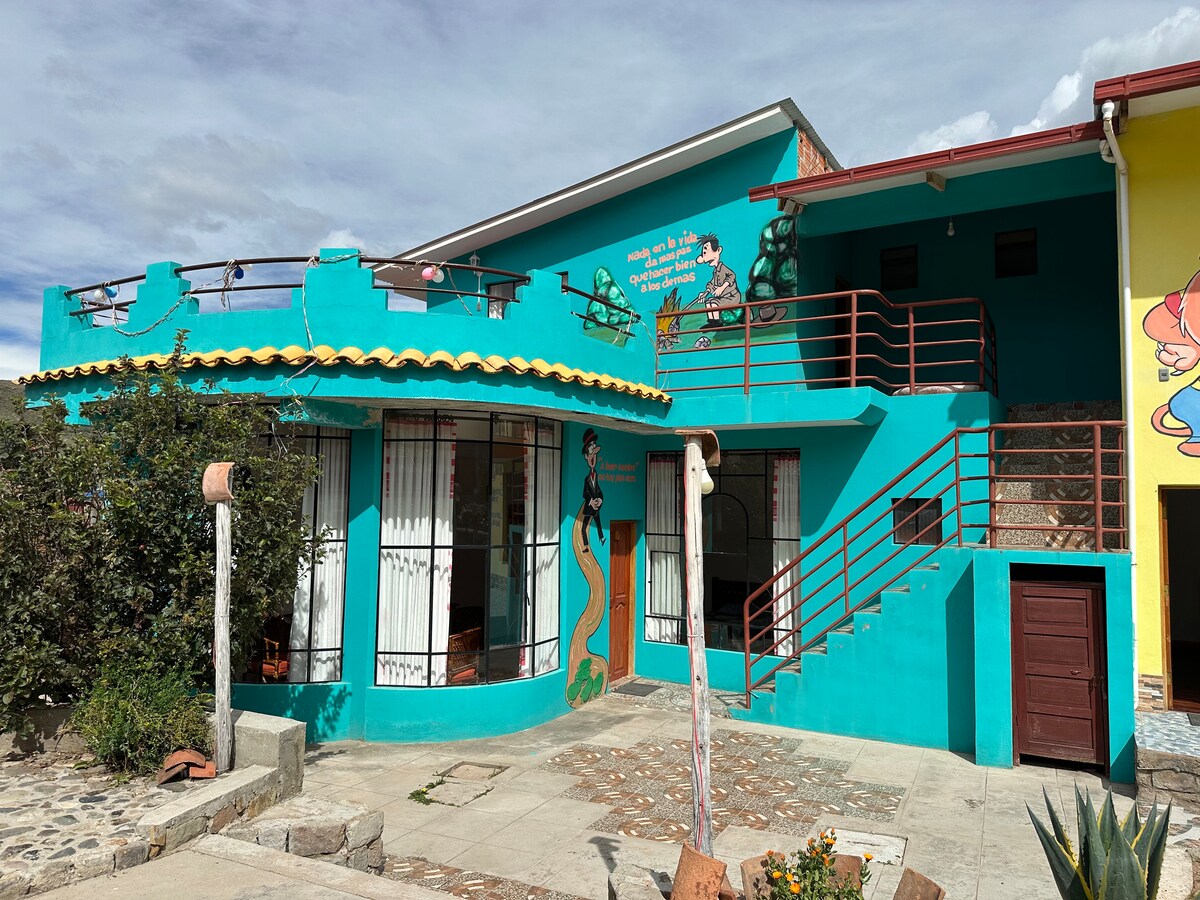 Slapp av på denne unike og rolige ferien. Vi er et landsted i Yumani-samfunnet. Dette rommet har eget bad og en fantastisk utsikt over innsjøen. Stilen vår er av aymara-opprinnelse, med gjenstander og malerier inspirert av urfolk. Vi har restauranttjeneste. Betjent av Martin og Justina, som vil gi deg de beste tipsene for å utforske Isla Sagrada.