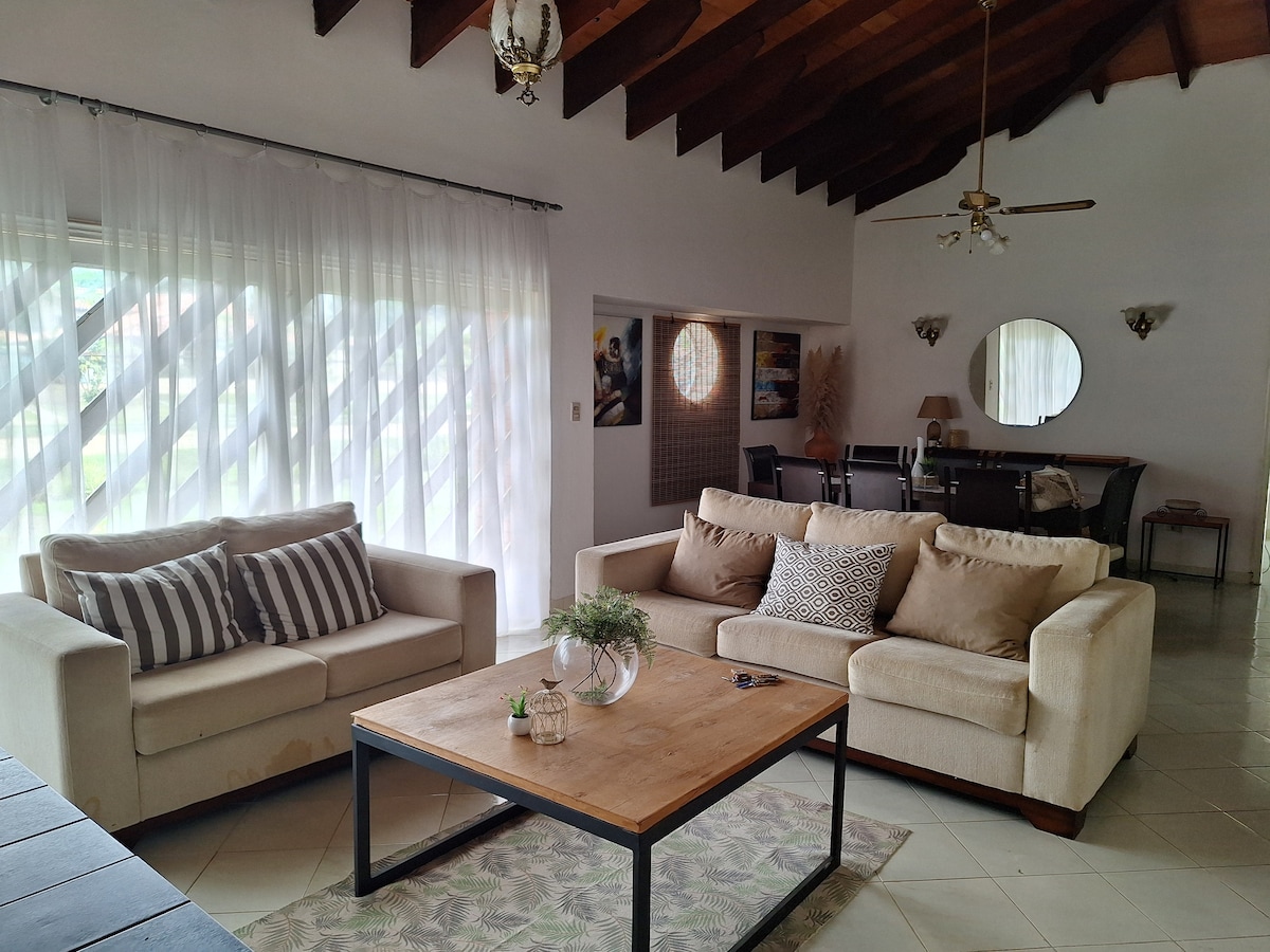 Flykt til dette koselige sommerhjemmet i San Bernardino, bare noen skritt fra innsjøen. Nyt en romslig uteplass omgitt av natur og et vakkert, moderne basseng. Slapp av i quincho med hengekøyer, grill og utsikt over terrassen. Med klimaanlegg, trådløst nettverk, strømmetjenester, brettspill og sikker parkering er dette hjemmet et koselig tilfluktssted ideelt for avslapning. Et sted med fred, hvor lyden av naturen og den fredelige atmosfæren inviterer deg til å slappe av og nyte øyeblikket.
