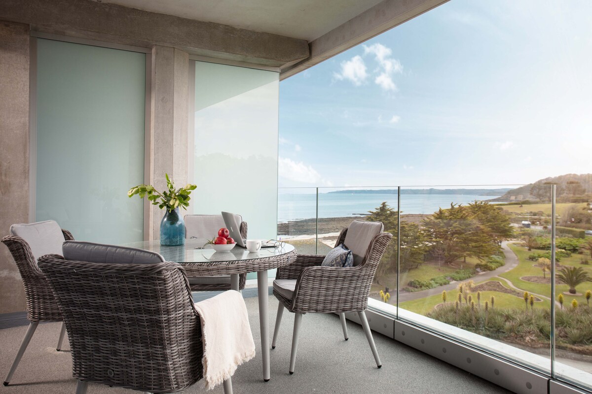 Den nydelige leiligheten vår med to senger ligger i rolige Maenporth i Cornwall. Den tilbyr fantastisk, uavbrutt havutsikt fra alle rom, en privat balkong, uteplass, hage og grill, to bad, fullt utstyrt kjøkken og smart-TV i både soverom og stue. Gratis tilgang til et 15 meter langt innendørsbasseng, boblebad, tennisbane og til og med pickleball! Stranden ligger nederst i bakken under leiligheten. Hvert rom har nylig blitt oppdatert med omtanke og et øye for detaljer. Mer informasjon nedenfor.