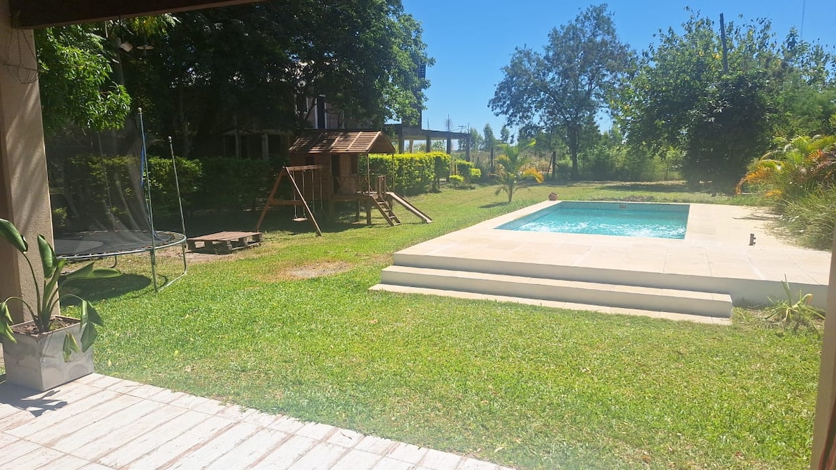 Bienvenidos, este lugar es único! Equipada con TV HD, wifi, aire acond. este espacio es ideal para relajarte y disfrutar. Nuestra parrilla interior es perfecta para preparar tus asados favoritos, piscina de 8x4m y galería exterior, ideal para disfrutar del atardecer. Nuestro parque te permite disfrutar de la naturaleza y poder realizar actividades al aire libre... fútbol, cama elástica, metegol o ping-pong. Posibilidad de alquilar cuatriciclos para que explores los alrededores. Te esperamos!