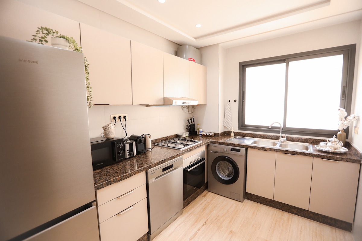 En romslig familie-leilighet i hjertet av Tanger. Ca. 300 m fra Marina-stranden, den gamle Medina og kjøpesenteret. Disse to soverommene har queen size-senger og et ekstra rom med to enkeltsenger, en stue/spisestue, to bad, utstyrt kjøkken, en vaskemaskin og aircondition. Nyt delvis havutsikt, en heis og tilgang til ulike underholdningsalternativer. Henting på flyplassen og turer til forskjellige destinasjoner mot et ekstra gebyr. Røykfritt. Balkonger er tilgjengelige for røykere. Takk skal du ha.