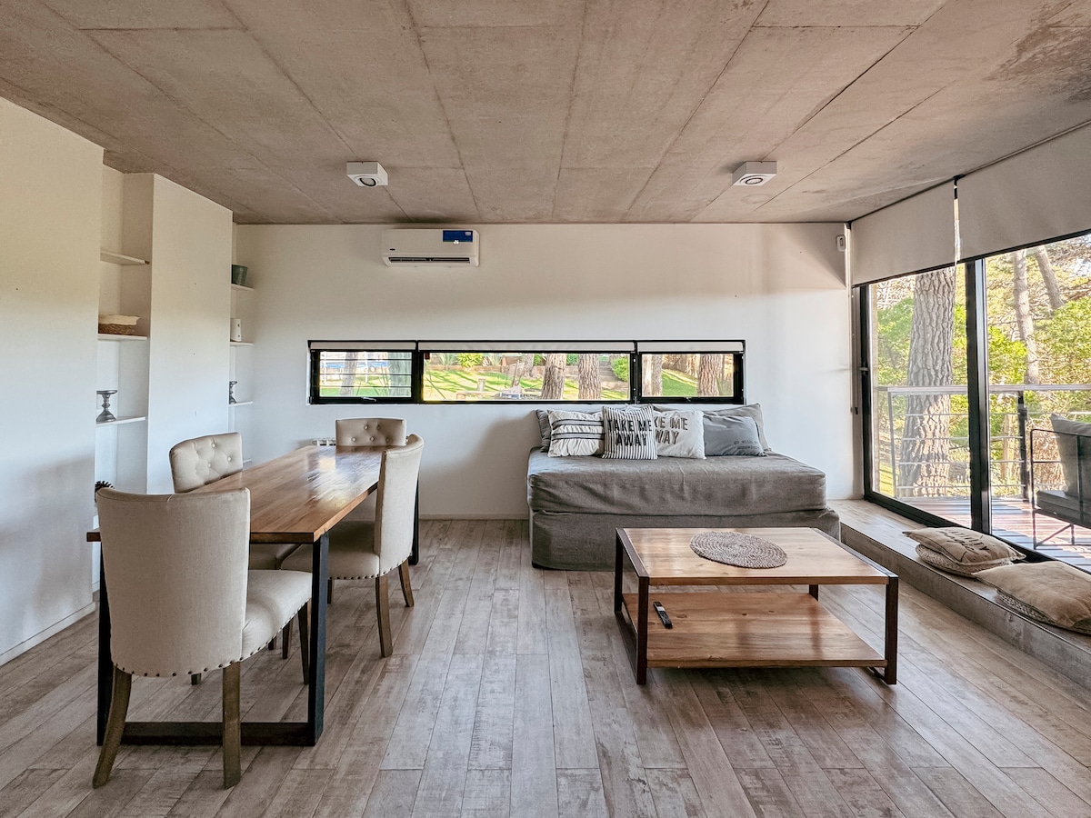 Increíble Micro Casa de Concreto en pleno bosque, respetando la naturaleza del lugar, únicoambiente con una cama queen, mesa escritorio, 2 sillas y WiFi. Baño con ducha, lavamanos, inodoro. Kitchenette con bacha, pava eléctrica, microondas y heladera con freezer, NO está para cocinar. Muy iluminada con el mar a 700m y el centro comercial a 600m. Esta hermosa casa está escondida detrás de la casa principal con total privacidad y autonomía. Asador exterior para uso común del lugar. Bienvenidos!