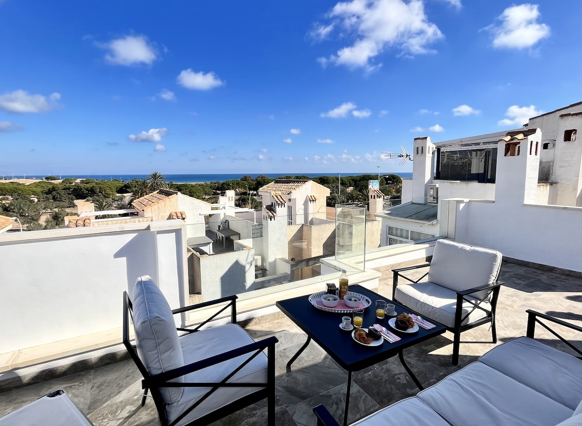 Velkommen til vår solfylte og stilig møblerte toppleilighet på Ibiza/marokkansk atmosfære. Innenfor gangavstand til stranden. Nyt naturen på den romslige balkongen med havutsikt, eller trekk deg tilbake til den store private takterrassen, hvor du kan sole deg, grille eller ta en drink i fred. Som gjest kan du også bruke den felles jacuzzien, to store svømmebasseng og et barnebasseng – perfekt for familier. En privat parkeringsplass er inkludert. VT-511692-A