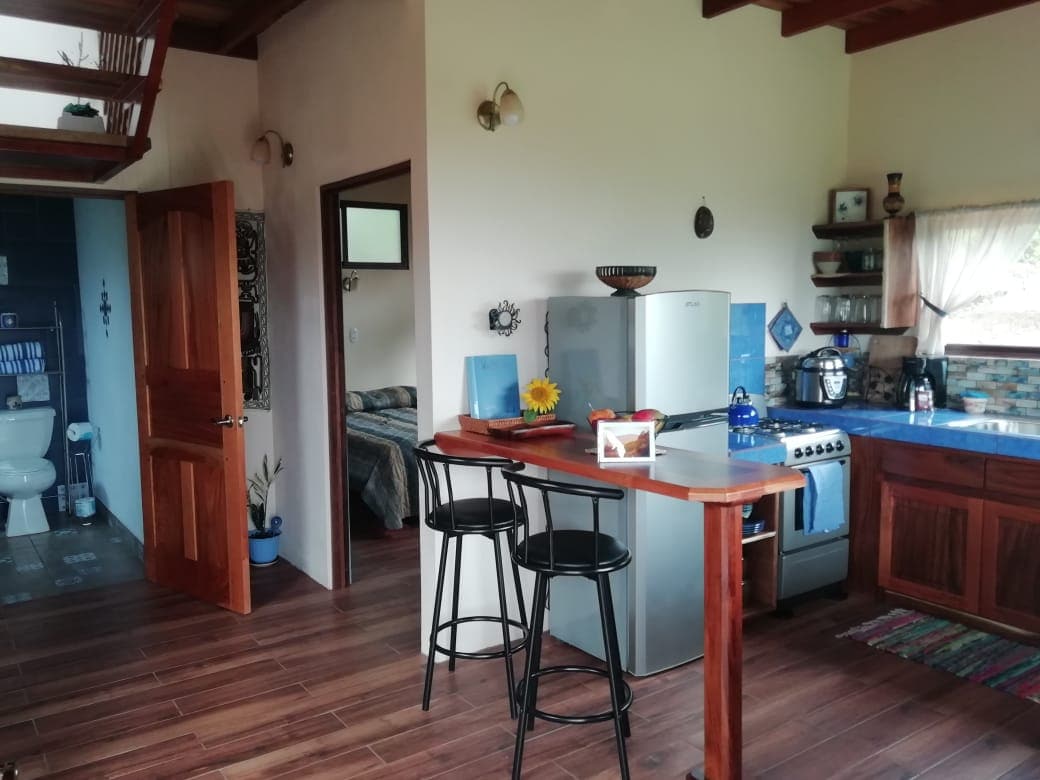 Koselig hytte omgitt av natur og tropiske hager, bare 30 minutter fra Arenal-vulkanen. Et lite paradis hvor du kan slappe av eller jobbe hjemmefra i fred og ro. Våkn opp til fuglesang, nyt den frodige vegetasjonen og en varm, privat atmosfære. Inkluderer raskt Wi-Fi, en arbeidsplass, et utstyrt kjøkken og en komfortabel seng. Plassert i et rolig, landlig nabolag, så av og til kan man høre lyder fra nabolaget – en del av sjarmen ved det lokale livet. Perfekt for å koble av og slappe av. Et lite paradis.