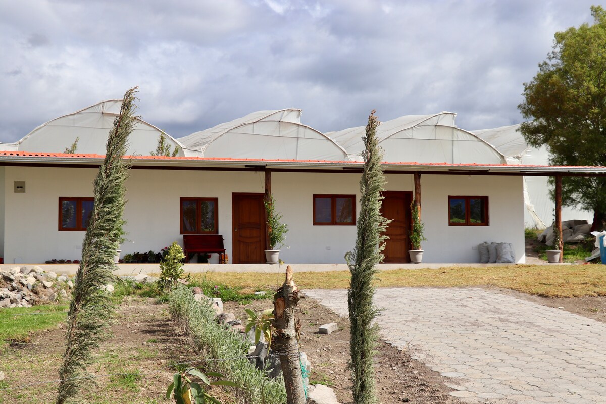 Nydelig suite med panoramautsikt over fjellene, romslige og komfortable rom og sosiale områder, utendørs basseng og jacuzzi, TRÅDLØST NETTVERK, fullt utstyrt kjøkken, gavekurv, terrasse og solskjerming. Ligger i San Jose de Chaltura, 15 minutter fra Ibarra, 1:30 timer fra den internasjonale flyplassen, Quito. Dette gårdshjemmet ble designet for å hjelpe deg med å komme i kontakt med naturen, hvile og fornye, omgitt av et unikt landskap, eksklusivt for deg. Eiendommen har seks hektar med hager, frukttrær og avokadotrær.