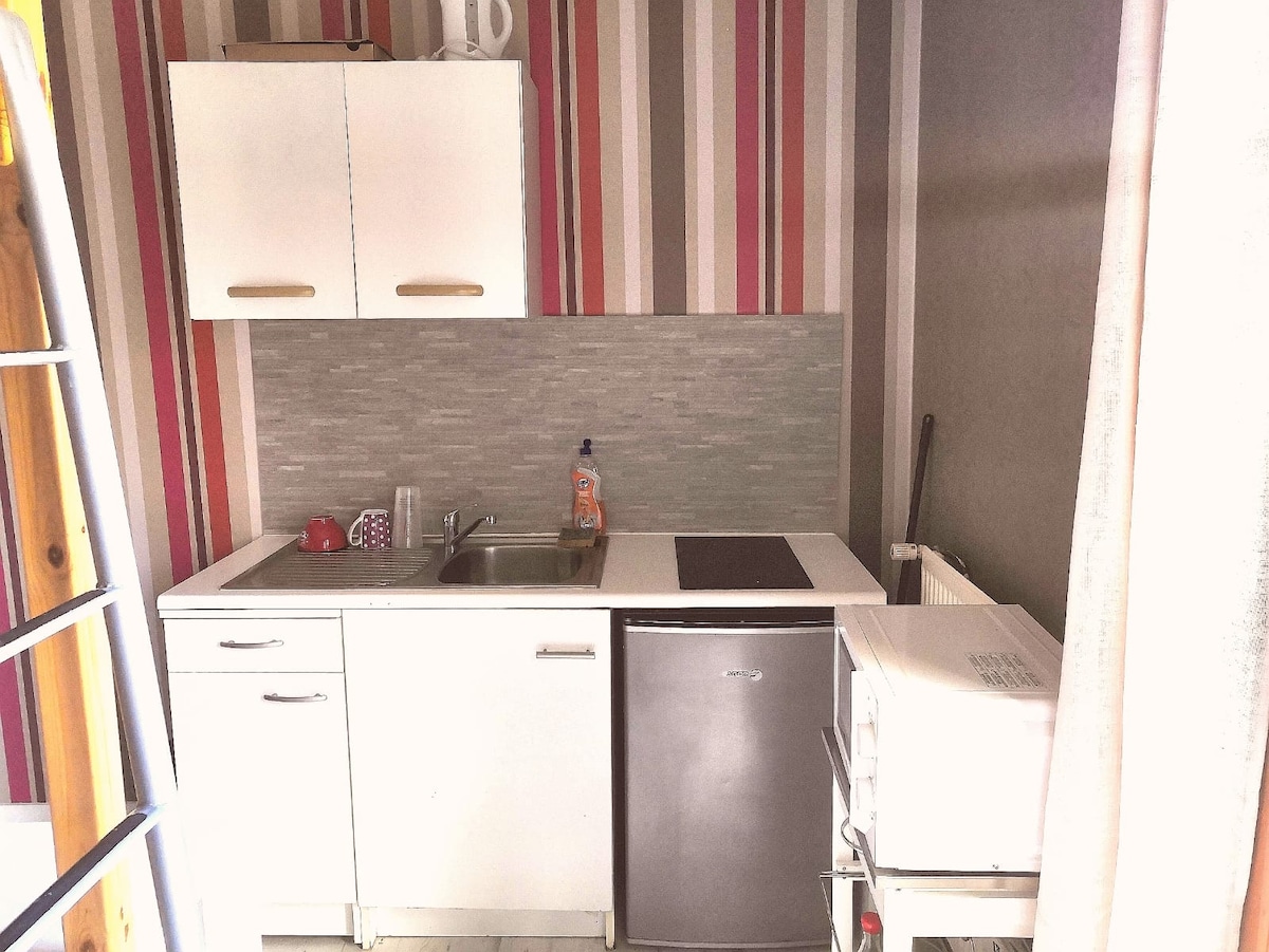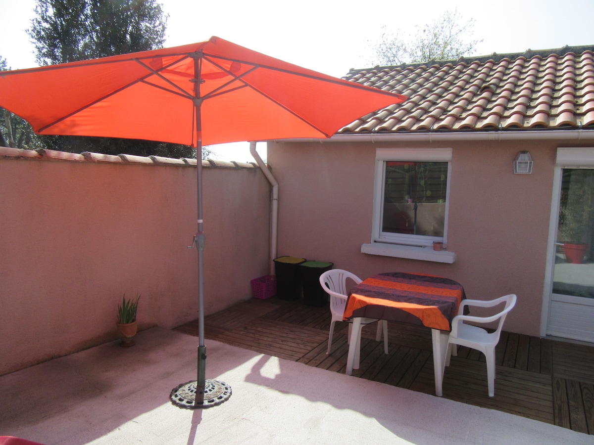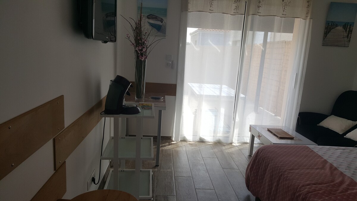 Privat og uavhengig studio, selvbetjent inn- og utsjekking 24/7. Gratis parkering i gaten. Boligen ligger i nærheten av en super U, anlagt park 2 minutter å gå og stranden 10 minutter å gå. Boligen ligger 2 minutter fra bussholdeplassen som går til jernbanestasjonen. Mezzanin med dobbeltseng (sengetøy følger med) Bad (håndklær/dusjsåpe/sjampo) Sammenleggbar seng tilgjengelig for en tredje reisende Kjøkken med alt du trenger + krydder. Kaffe, te, kjeks Stue med utsikt over terrassen.