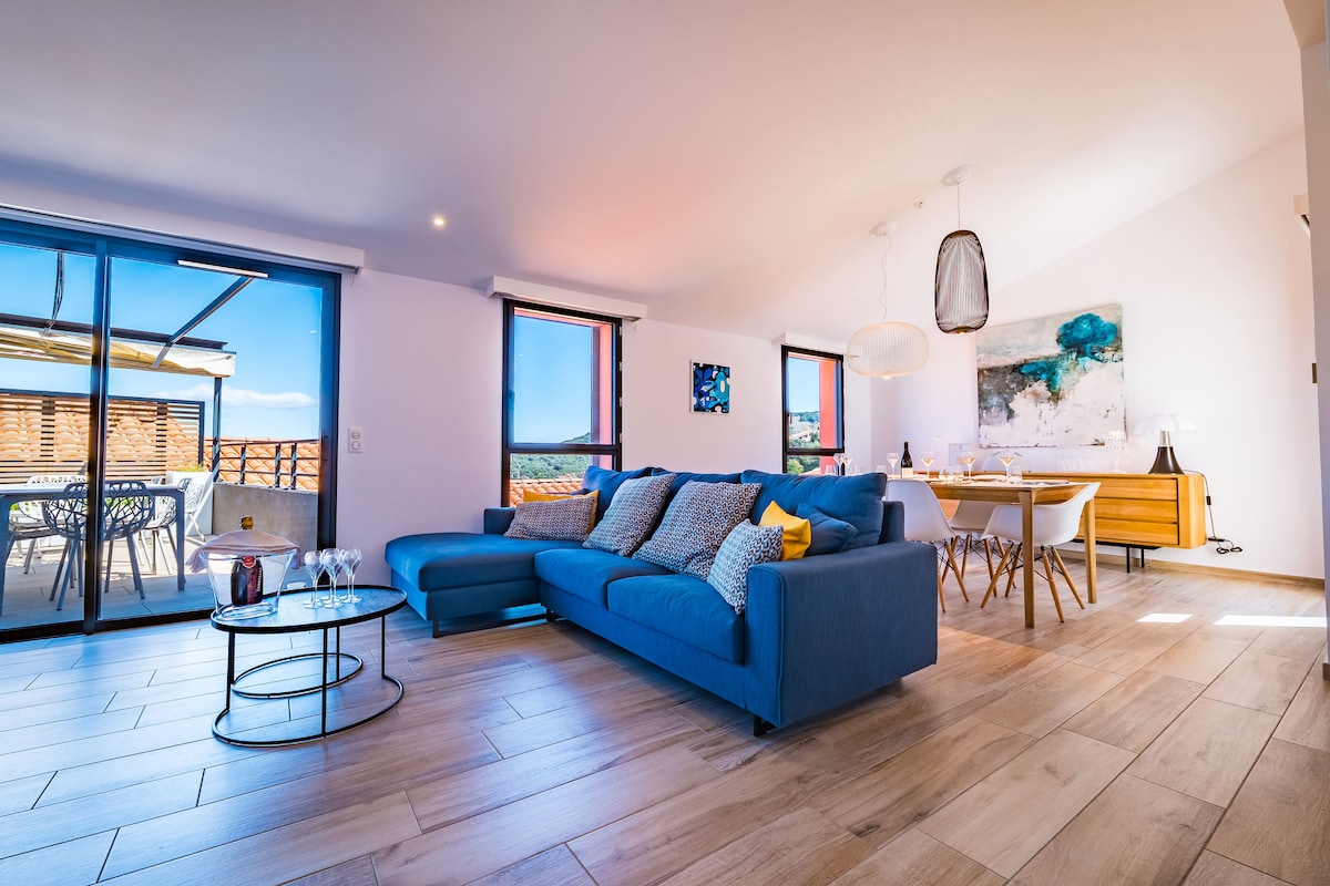 "La Terrasse Bleue" er en 3-roms leilighet på 75 m2, vendt mot havet. Fantastisk, uavbrutt panoramautsikt over havet. Denne nye luksusboligen, som skal fullføres i enden av juni 2023, ligger bare en 5-minutters spasertur fra buktene. Denne leiligheten i første etasje i første etasje har en stor 47 m² terrasse vendt mot havet og utsikt over Fort Saint-Elme. - Stue som åpner ut mot terrassen: stort utstyrt kjøkken/spisestue med spisebord, sofa og TV. - to soverom som åpner ut mot terrassen