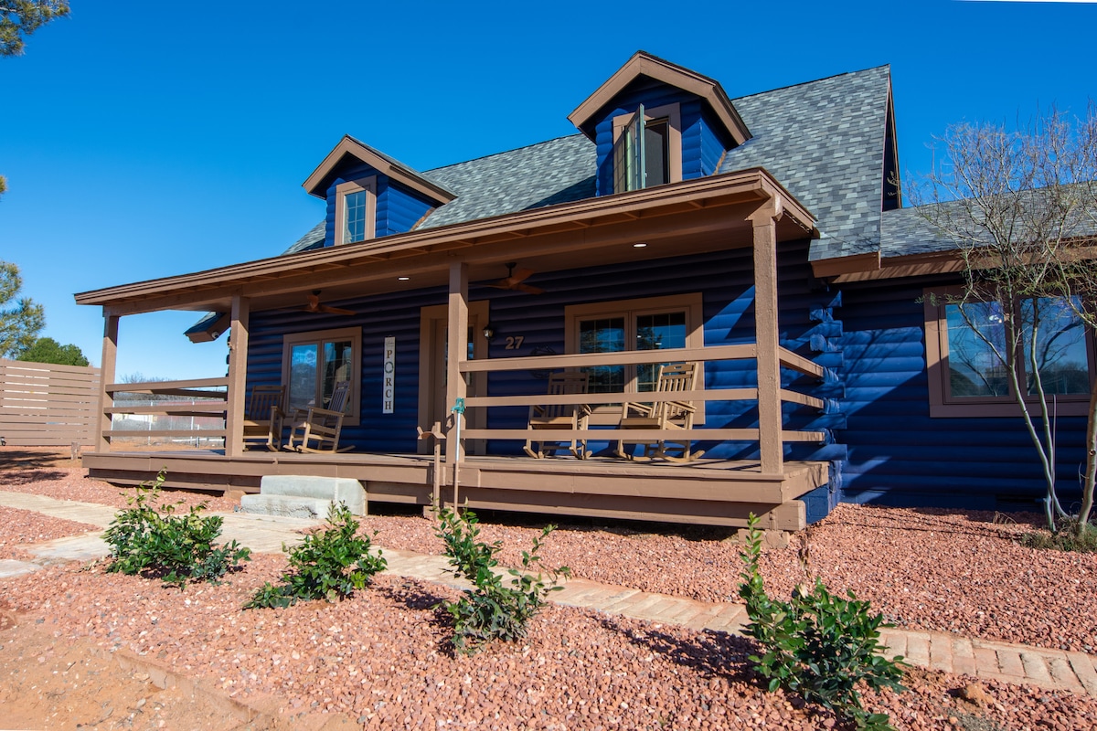 Nyt roen i en tømmerhytte ved foten av de ikoniske røde klippene. Omgitt av natur og nydelig utsikt. Berømte Jacks Canyon Trailhead ligger innenfor gangavstand fra ytterdøren. Minutter fra fasiliteter og sentrum av Sedona. Boblebad, dampsauna, bålplass, grill og separat inngjerdet hundegård utenfor vaskerommet. Nyt utsikten fra den rolige, overbygde terrassen og den omsluttende verandaen. Du kan til og med få et glimt av ugglen vår.