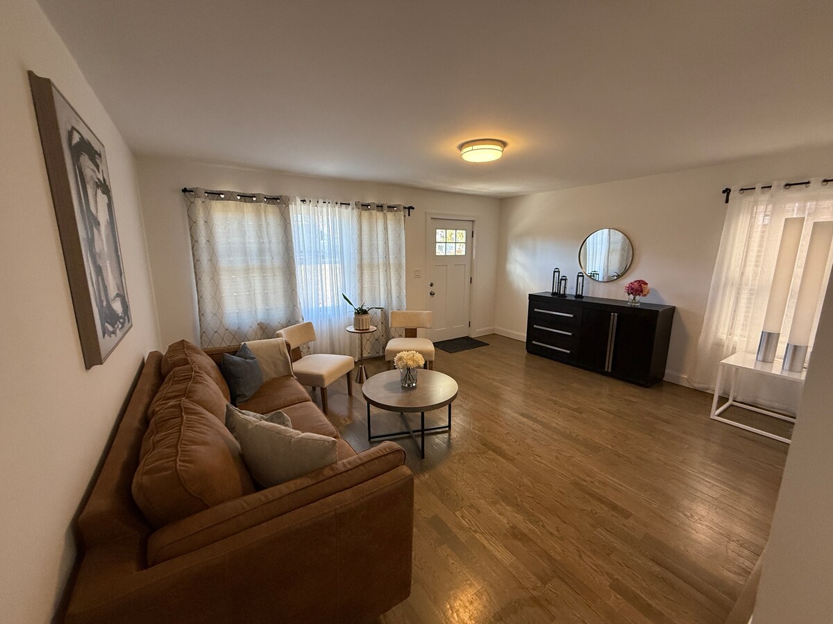 Reis til Norwalk Cottage, et vakkert designet hjem med fire soverom og to bad som er perfekt for åtte gjester. Dette familievennlige overnattingsstedet har et fullt utstyrt kjøkken, en koselig peis og et morsomt lekerom i kjelleren. Slapp av i den private bakgården med terrasse, grill og bålplass. Beliggende på den rolige grensen mellom Norwalk og Westport, er du bare noen minutter unna Calf Pasture Beach, flotte restauranter og det pulserende SoNo-distriktet. Nyt sentral luft, raskt trådløst nettverk og et dedikert arbeidsområde for den perfekte helårsferien.