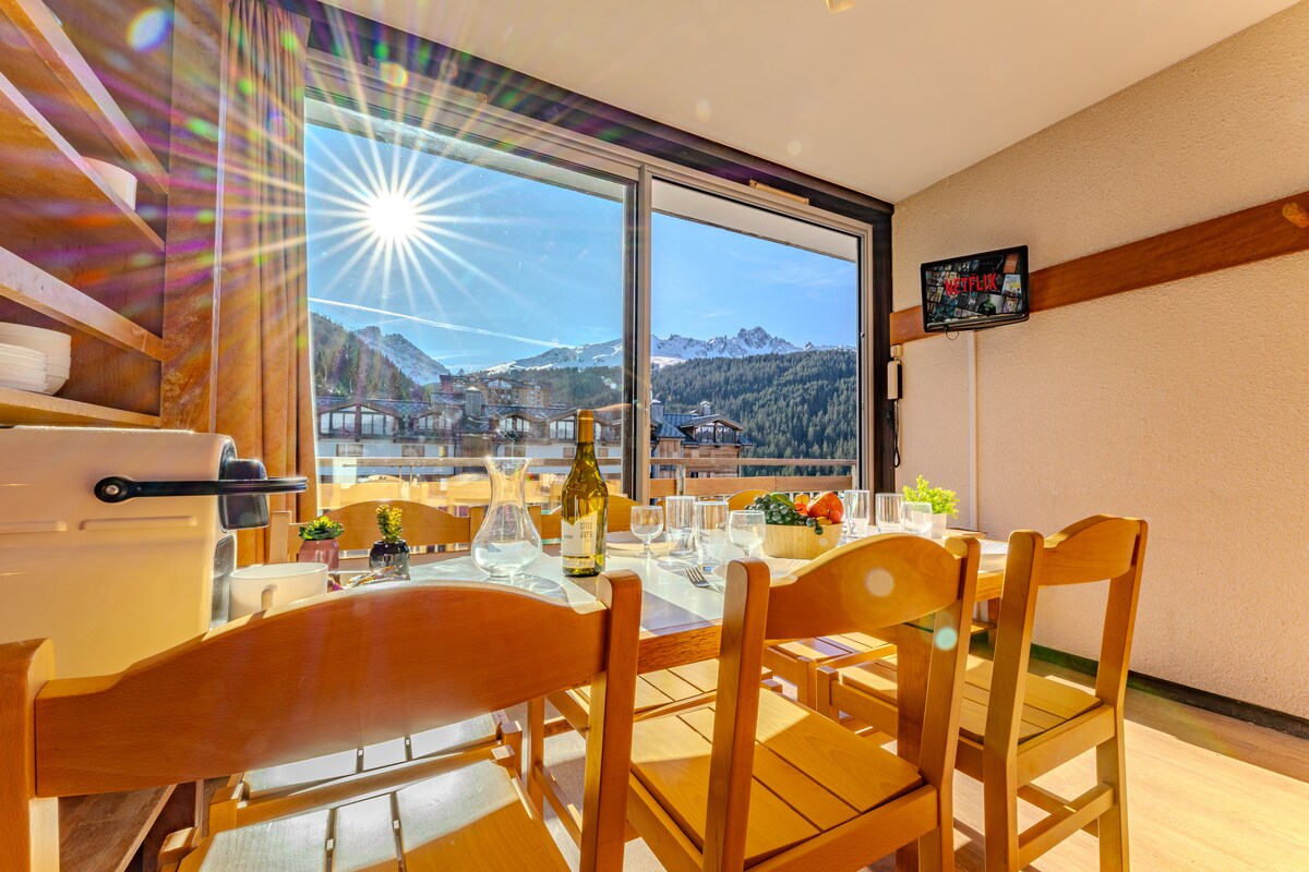 Nyhet! Komfortabel leilighet, inkludert 1 soverom med 1 dobbeltseng på 180 cm, kan justeres til 2 senger på 90 cm. Utstyrt kjøkken, sovesofa for 2, bad med stor dusj og separat toalett. 5 minutter fra alle fasiliteter (butikker, heiser, gratis skyttelbuss, mange restauranter, inkludert en stjernerestaurant "azimut"). Parkering for 2 biler foran boligen. Uhindret panoramautsikt over fjellene (Vanoise). Skiheis 50 m unna.