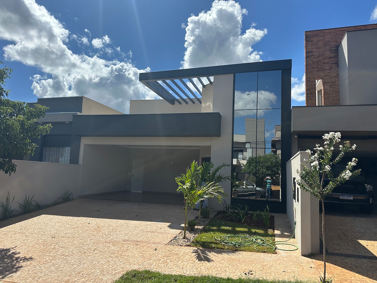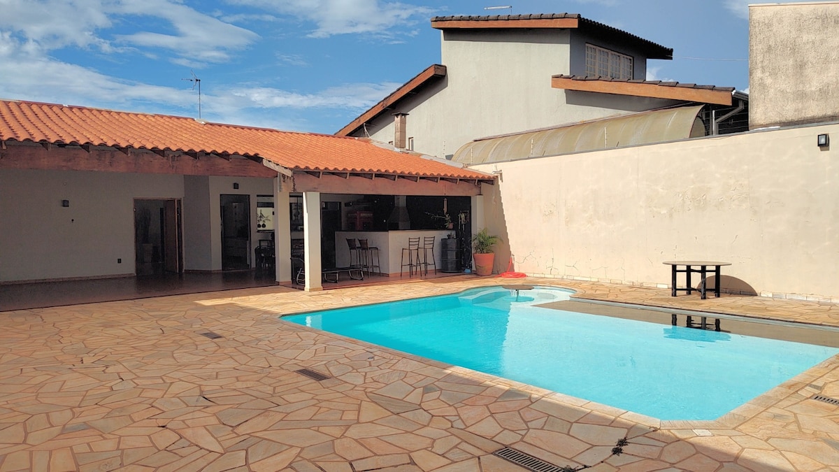 Romslig, komfortabelt hus med tre soverom med klimaanlegg, svømmebasseng og gourmetområde med grill – ideelt for spesielle familiemomenter. Privilegert beliggenhet i Ribeirânia, 15 minutter fra Taiwan Event Center og Golf Space, perfekt for de som kommer til avgangseksamener og arrangementer. Ved siden av Novo Shopping, Hard Rock Cafe, Arena NicNet, Parque Curupira og UNAERP og Estácio Colleges.