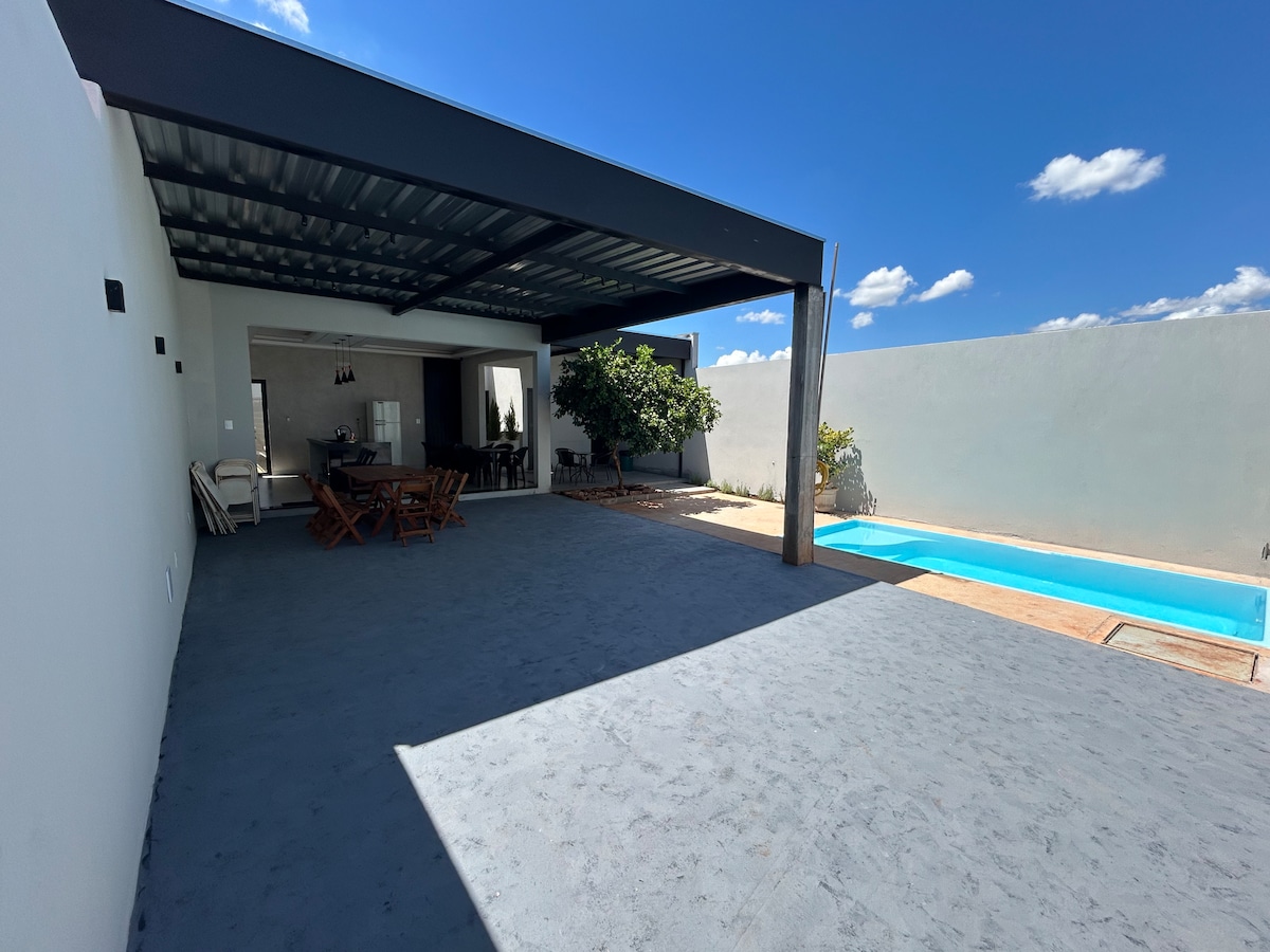 Møblert hus med fire soverom med klimaanlegg og et komplett fritidsområde med svømmebasseng og grill. Helt trygt og ideelt for familiesammenkomster og fester. Vi er i et av de edleste nabolagene i Ribeirão Preto, den botaniske hagen. Beliggenheten vår gir enkel tilgang for de som deltar på eksamen og arrangementer, 10 minutter fra Taiwan Event Center og 15 minutter fra golfstedet. Huset er i en region med enkel tilgang til markeder, kjøpesentre og restauranter.