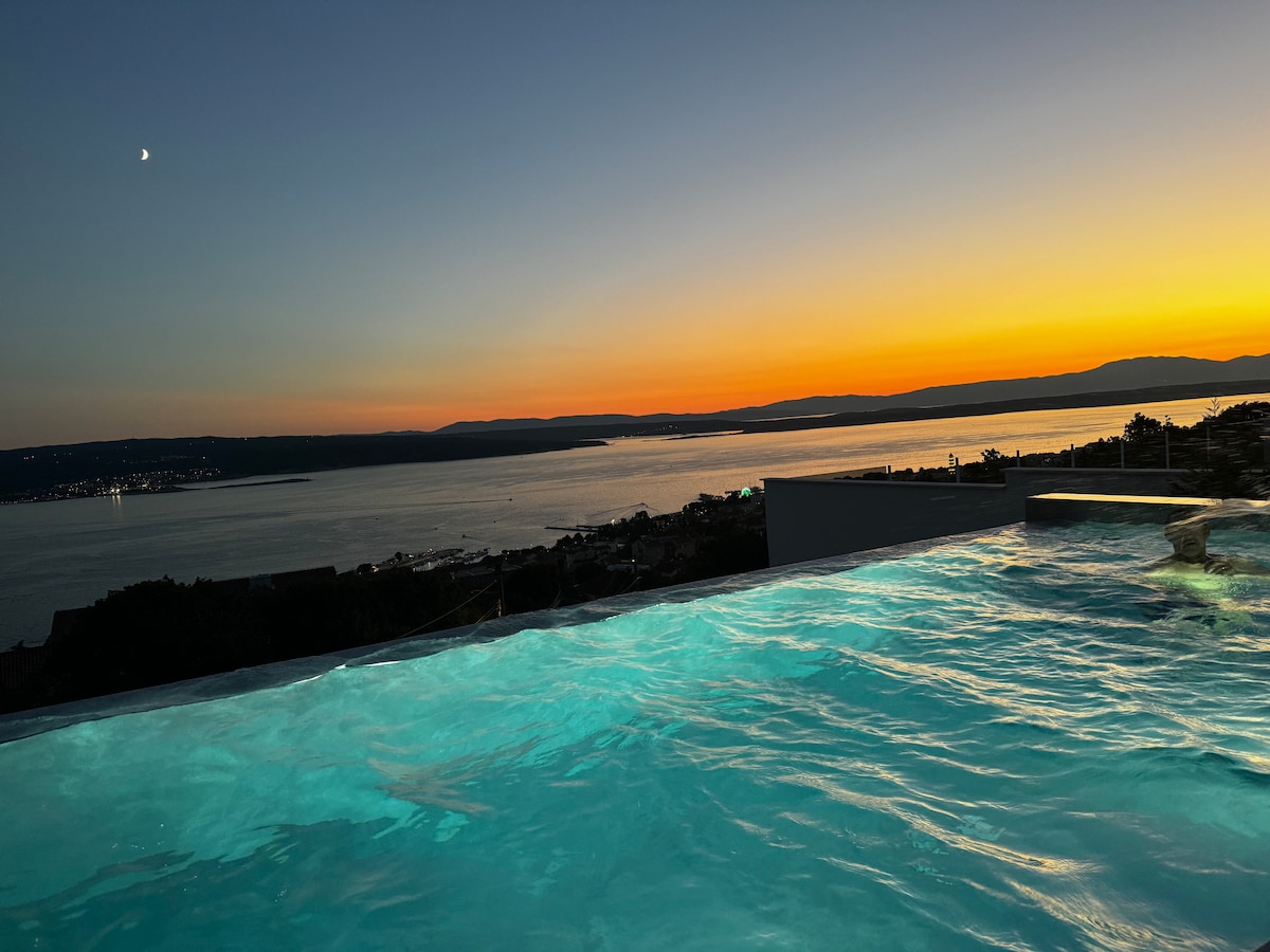 Ny 2025. Femstjerners villa i Crikvenica er perfekt for en avslappende ferie med familie eller venner. Nyt et stort basseng på 40 m² med integrert massasje, omgitt av dekkstoler og en romslig terrasse utstyrt med grill og hagemøbler med utsikt over havet og naturen. Villaen er fullt utstyrt med aircondition, alle fem soverommene, og stuen har sin egen aircondition (totalt seks). Ladestasjoner for elektriske kjøretøy er også tilgjengelige for gjestene.