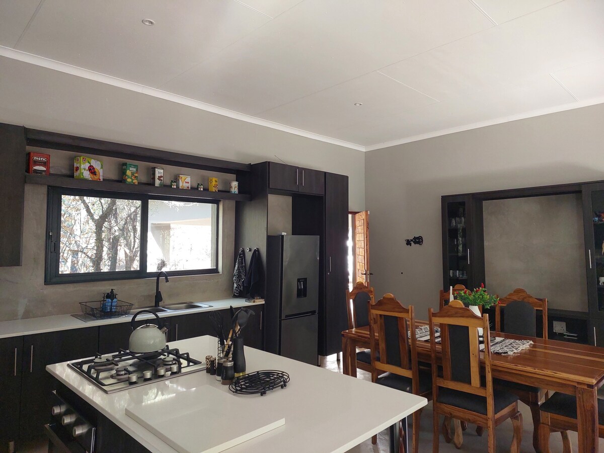 Et vakkert moderne hus i bushveld som bor i Kruger nasjonalpark. Perfekt utstyrt for en familiesammenkomst. Ikke rovdyr streifer fritt, og de store 5 kan ofte sees fra pikniksteder langs elven. Kruger nasjonalpark ligger bare 15 minutters kjøretur unna. Hjemmet har alt for å gjøre oppholdet ditt så komfortabelt som mulig. Kjøkkenet er fullt utstyrt med alle modcons. Full DSTV er tilgjengelig, et plaskebasseng og braai (grill) for de lange sommerdagene og nettene.