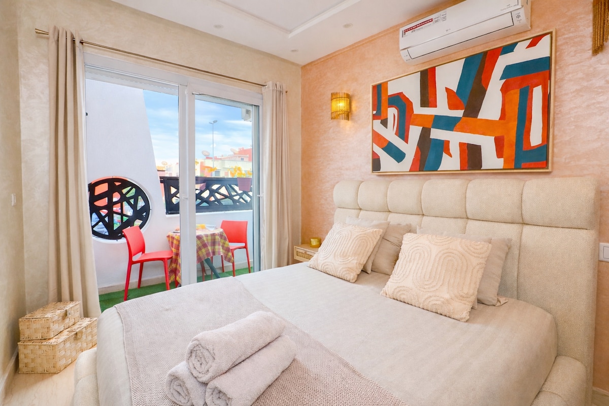 OCEAN82s toppleilighet ligger rett ved stranden i Taghazout. Den romslige leiligheten med solrik terrasse har utsikt over bukten og havet. Slapp av i den store kingsize-sengen, tilbered frokosten på det åpne kjøkkenet og tilbring ettermiddagen på solsengen. Sengene kan skilles, slik at du kan dele toppleiligheten med en venn. Inkludert er et privat bad, et fullt utstyrt kjøkken, klimaanlegg for varme sommerdager og raskt trådløst nettverk.