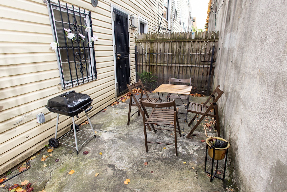 Private Modern Suite ➕Fabulous Backyard🌴 THE PLACE: 🛏 Queen bed: premium sheets, Casper mattress & Memory foam pillows 🛋 Sofabed 🌴🏡 backyard 🔥 with fireplace 🔥 🍹Welcome drinks & 💧water 📺 smart TV 📶 ⚡️Fast! Wifi ✔️Blow drier - iron ☕️ Coffee 🍳Hot Plate & small meals - No 🚫kitchen 🚪🏃🏽♀️self check-in GETTING AROUND 🚉 subway 3 blocks away, 30m to Manhattan ✈️JFK & LGA are 15-20m away, all shopping essentials are steps away
