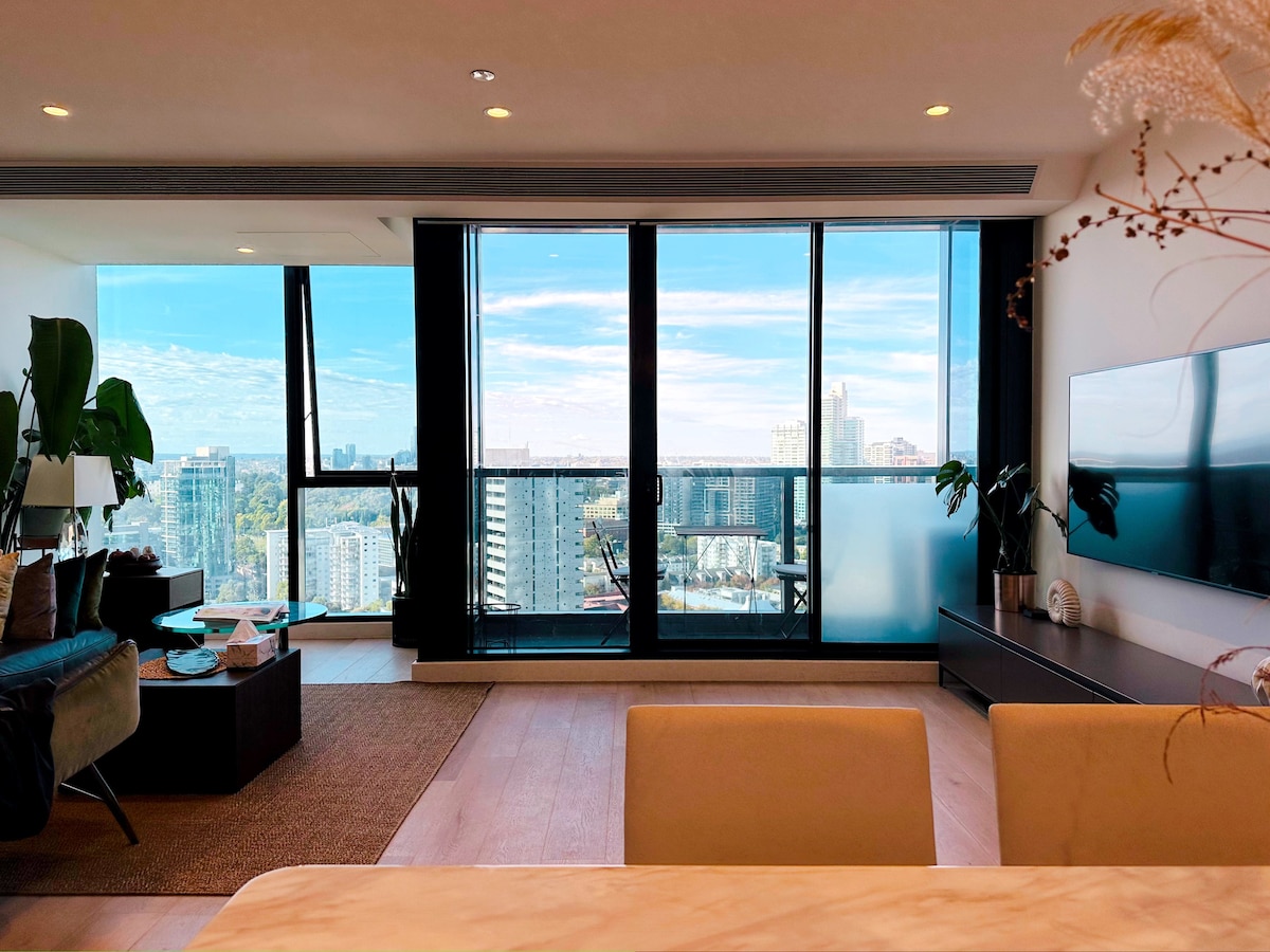 Et av Melbournes kuleste Airbnb! Denne toppleiligheten serverer 270 graders panoramautsikt over Yarra River, og tilbyr en blanding av luksus og moderne design, og praktisk tilgang til byen. Det gir den perfekte basen for deg som ønsker å nyte Melbourne på sitt beste. Enten du er en profesjonell som ser etter et urbant tilfluktssted eller noen som søker en stilig leilighet i hjertet av byen, leverer Aura både komfort og bekvemmelighet, fra takterrassen med utsikt til de toppmoderne fasilitetene.