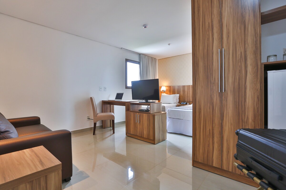 Oppmerksomhet: DETTE ROMMET HAR KLIMAANLEGG Paiaguas Hotel ligger i Cuiabás finanssenter, 1 km fra Pantanal Shopping. Prisen inkluderer frokost, trådløst nettverk og bruk av hotellets fellesområder (treningsstudio, svømmebasseng,forretningssenter og grill). Rommene er utstyrt med klimaanlegg, TV, safe og minibar. Alle har et eget bad med hårføner. Vi har parkeringstjeneste på hotellet for R$ 30/dag. Diaria Pet: R$ 80/natt
