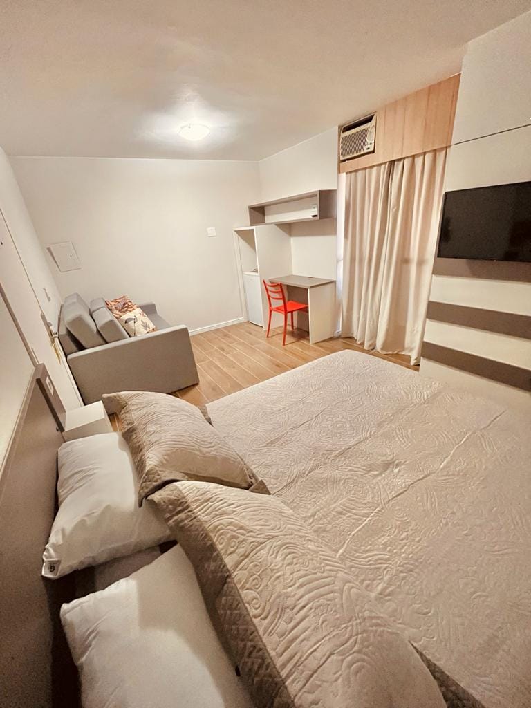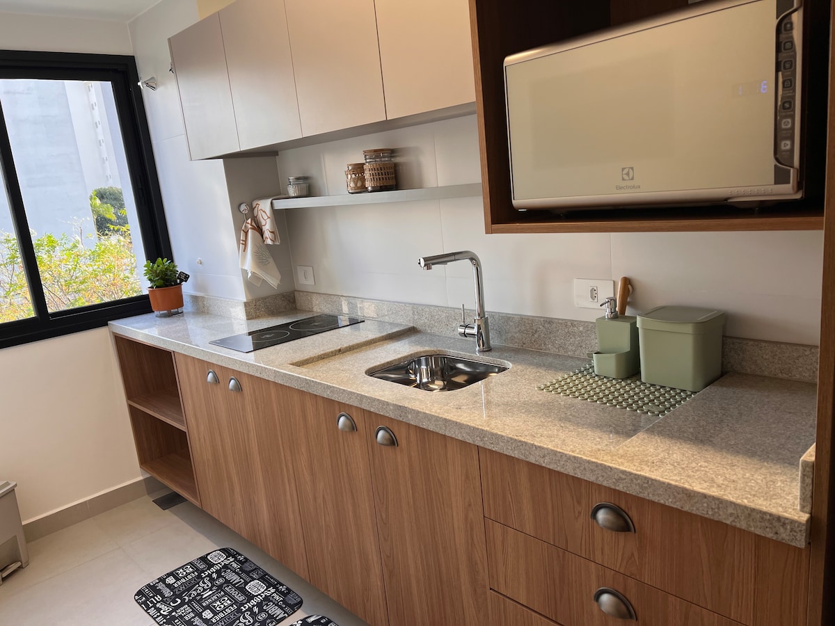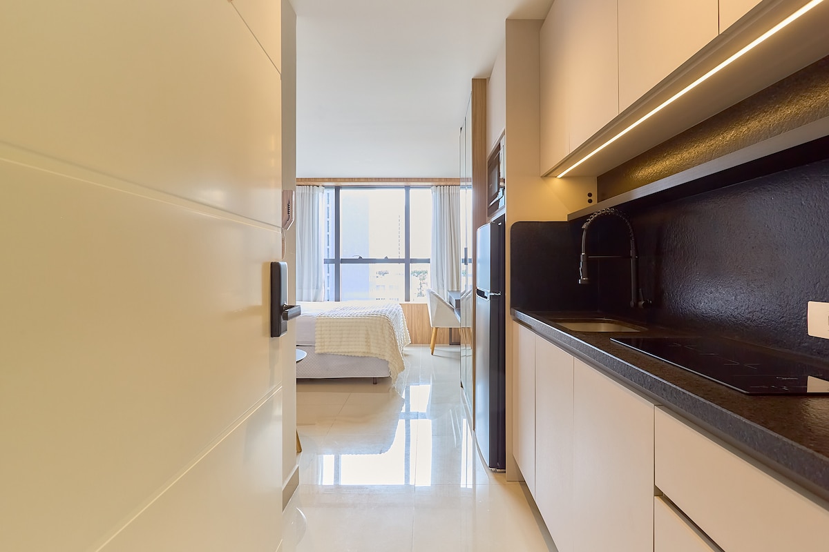 Ny og komfortabel studio i hjertet av byen. 24-timers resepsjon, kafé/restaurant, kontorfellesskap, treningsstudio, vaskeri og sykkelutleie – alt i selve leilighetskomplekset. Ideell beliggenhet for turisme og forretninger. Enkel tilgang til busstasjon og flyplass, busslinje for turister, på siden av ikoniske Rua XV, kjøpesentre, Guaíra-teateret, det føderale universitetet, i tillegg til nærheten til Couto Pereira stadion og Pedreira Paulo Leminski/Ópera de Arame, som er arena for store konserter.