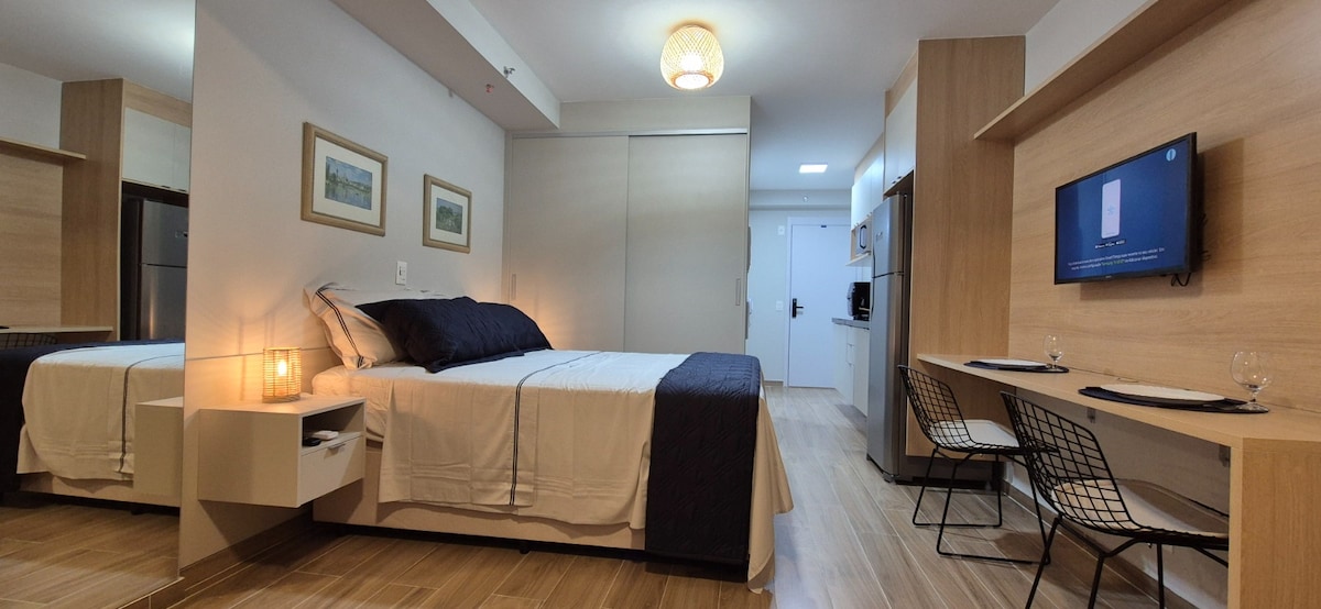 Komplett studio i Vila Mariana, ideelt for opptil to personer, med en queensize-seng, klimaanlegg, mørkleggingsgardin, 43 tommers smart-TV, trådløst nettverk og utstyrt kjøkken. Vi tilbyr sengetøy og badetøy. Ny leilighet med svømmebasseng, treningssenter, kontorfellesskap, lekerom, vaskeri (betales separat), døgnåpen concierge og et kjøpesenter med restauranter og bekvemmeligheter. 500 meter fra Santos-Imigrantes T-banestasjon, på Rua Vergueiro, med enkel tilgang til Av. Paulista, museer, sykehus og tjenester. Perfekt for fritid eller arbeid.