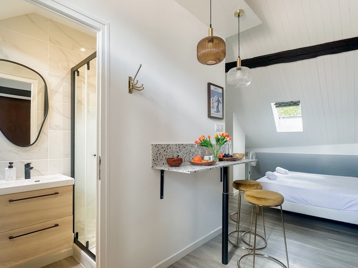 Vår T1 bis ligger over garasjen vår, tilknyttet huset vårt. Inngangen er uavhengig, uten vis-à-vis, med parkeringsplass tilgjengelig. Vi er i Cruseilles, en liten by med alle fasiliteter, halvveis mellom Annecy (20 minutter) og Genève (20-30 minutter) og 5 minutter fra motorveiinngangen, slik at du enkelt kan krysse Savoie-området. Hvis det er to gjester som sover i to separate senger, ber jeg om et tillegg på oppholdet på 10 €.