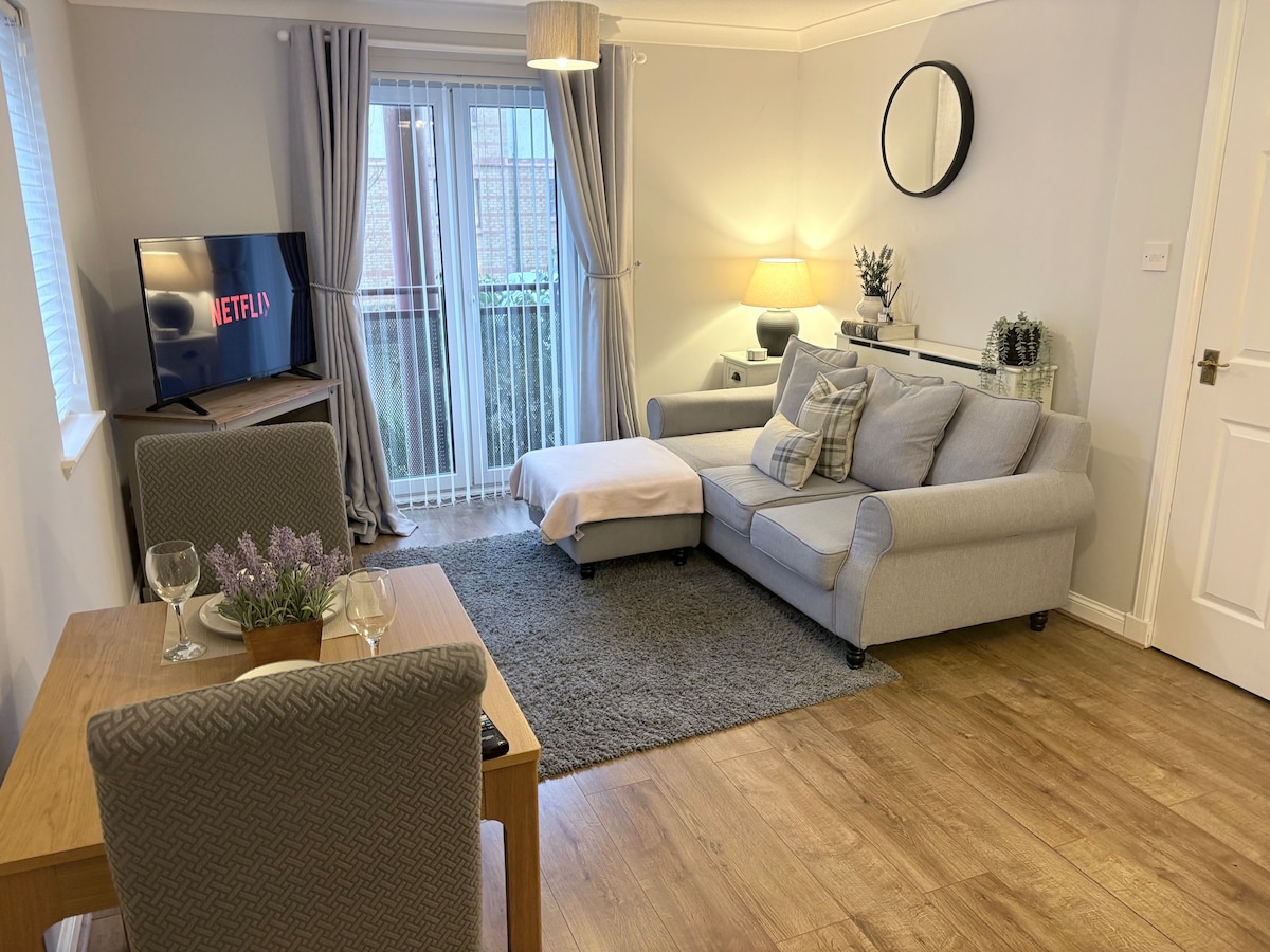 Riverside View er en moderne leilighet med to soverom i første etasje, og den ligger ved bredden av elven Ayr. Den har en privat terrasse med utsikt over elven, som fanger solen fra morgen til kveld. Leiligheten ligger i sentrum av Ayr, bare en kort spasertur fra barer, restauranter og butikker. Leiligheten er trivelig og komfortabel, har gratis trådløst nettverk med stor smart-TV og også liten smart-TV i soverommet foran, fullt utstyrt kjøkken med vaskemaskin og kaffemaskin også.