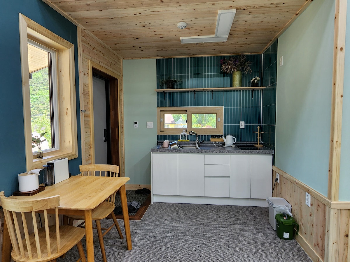 Det er et rolig, idyllisk og eksotisk lite fristed i skogen som ligger på en bakke på vei 59 ved Namhangang, 10 minutter med bil fra Danyang. Standard for 1 person, kan brukes av opptil 2 personer uten tilleggskostnad. Du kan se den flotte elvebredden gjennom vinduet, og du kan se hagen som eieren tar vare på i bakgården. Grilling er mulig, og det er en ekstra avgift på 20 000 won for kullgrilling. Vi tilbyr håndlagde smørbrød og americano mellom kl. 08.00 og 22.00. Hunder tillatt (opptil 1 hund, 10 000 KR ekstra.) Det er gratis parkering rett utenfor rommet, som er tilknyttet parkeringsplassen. Nyt en avslappende pause på dette rolige stedet.