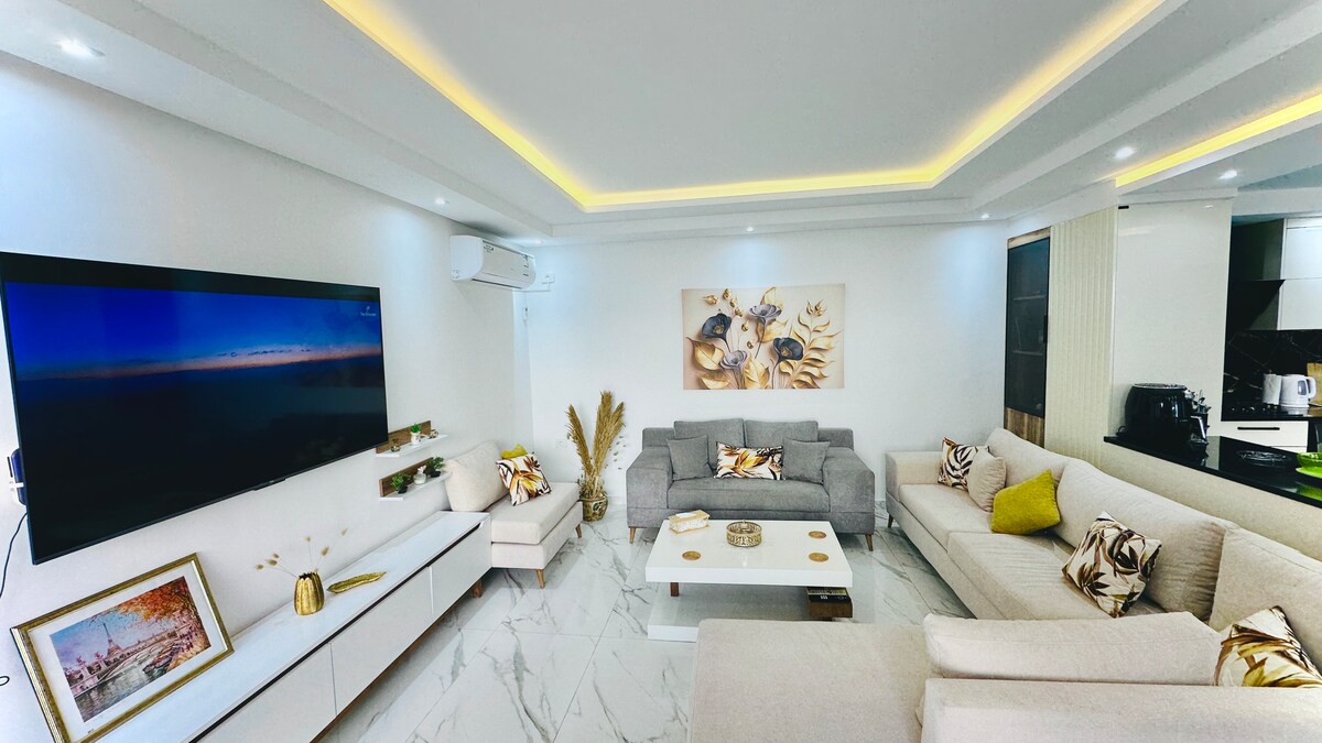 S+2 leilighet en 3-minutters spasertur fra stranden, dekorert med et moderne tema og farger,komfortabelt og elegant,det tilbyr et ideelt designet sted for å kombinere et øyeblikk med fritid og avslapning ,oppleve ferien din,lange opphold...i full frihet og uavhengighet i en av de vakreste byene i Capbon Kélibia,i en bolig bevoktet og sikret av en digicode tilbyr deg det beste av kravene til komforten i den moderne livsstilen for å skape en varm og avslappende atmosfære.