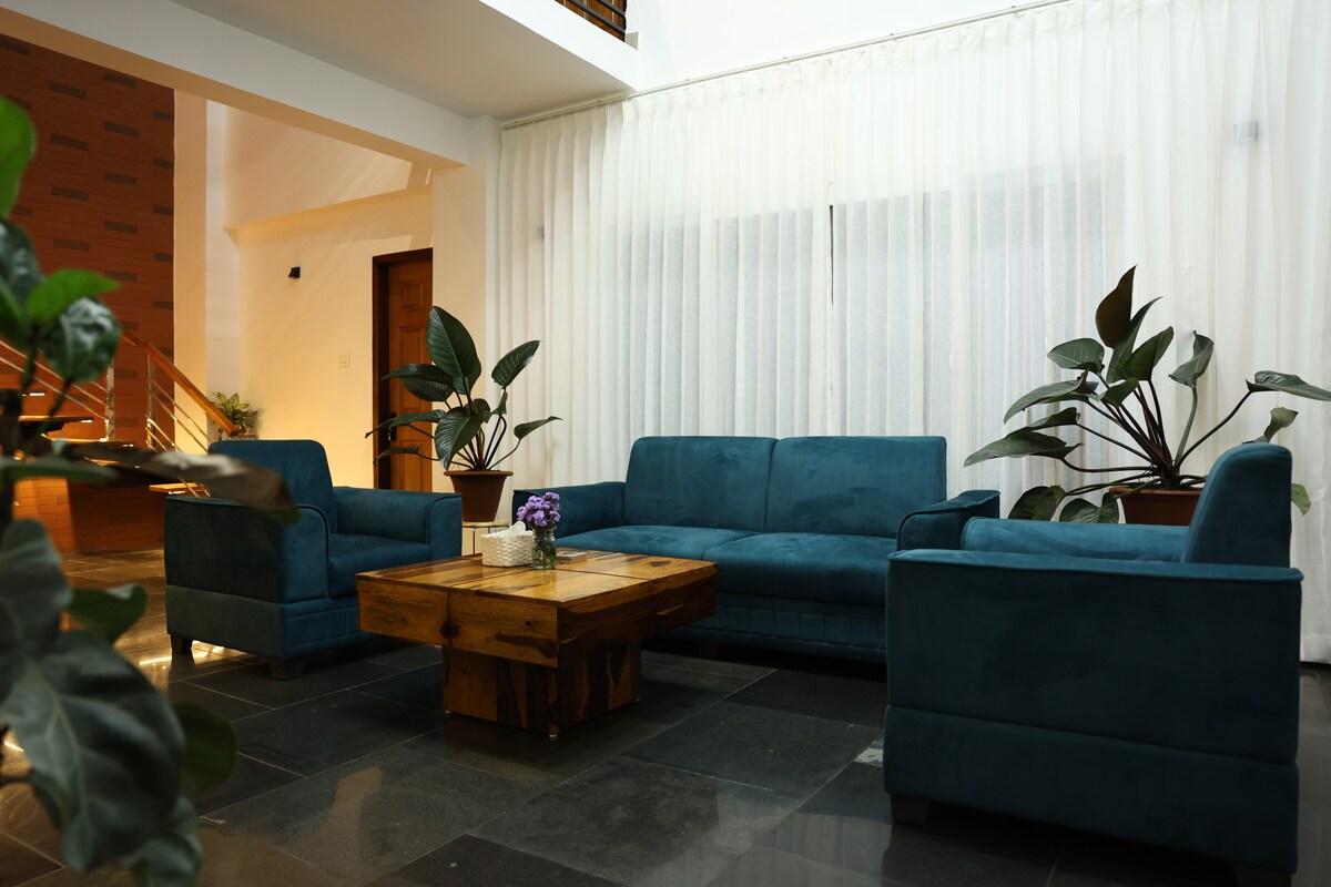 En sjarmerende ferie, omringet av frodige tehager og himalayanske åser. Ingen støy forventes etter kl. 20.00. Vi tilbyr dette utsøkte stedet for å gi gjestene våre den beste komforten og fritiden, eller til og med hvis man ønsker å føle seg som å jobbe hjemmefra. Vi har to store senger på et romslig soverom med soveromslås og tilhørende bad, separat kjøkken og 360° utsikt over kanyam/fikkal/shree antu fra terrassen med grilloppsett, bål, sykling, fiske og skogcamping i nærheten av fiskedammen i nærheten.