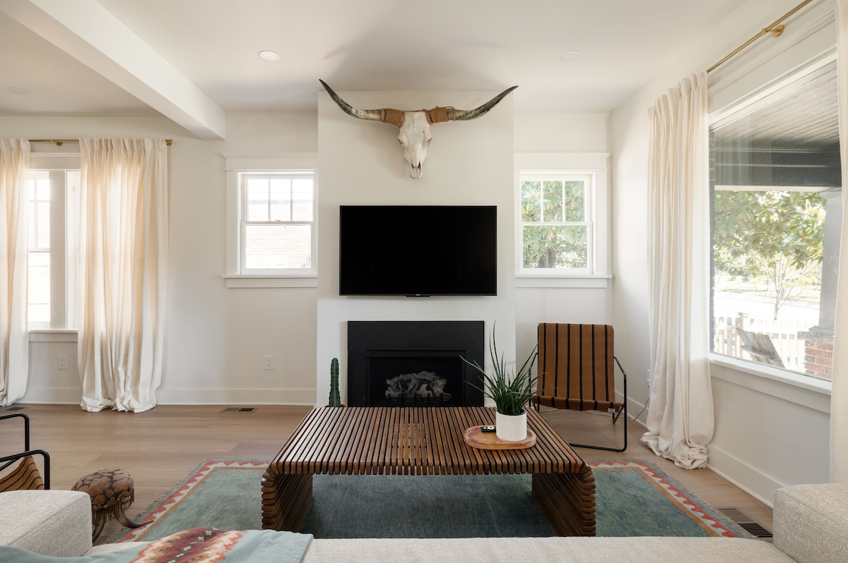 Whiskey & Wildflowers er din private spa-ferie med tre soverom, bare fem minutter fra Broadway! Slapp av i cowboybassenget, slapp av i saunaen i sedertre, eller slapp av på den overbygde terrassen på baksiden. Perfekt for utdrikningslag, bursdager og helgeturer. På innsiden kan du nyte stilig innredning, koselige oppholdsrom og alt du trenger for et komfortabelt opphold. Bakgården er helt inngjerdet med gress – flott for privatliv og gruppesammenkomster. Mindre enn 1,6 km fra Geodis Park og i nærheten av populære steder.
