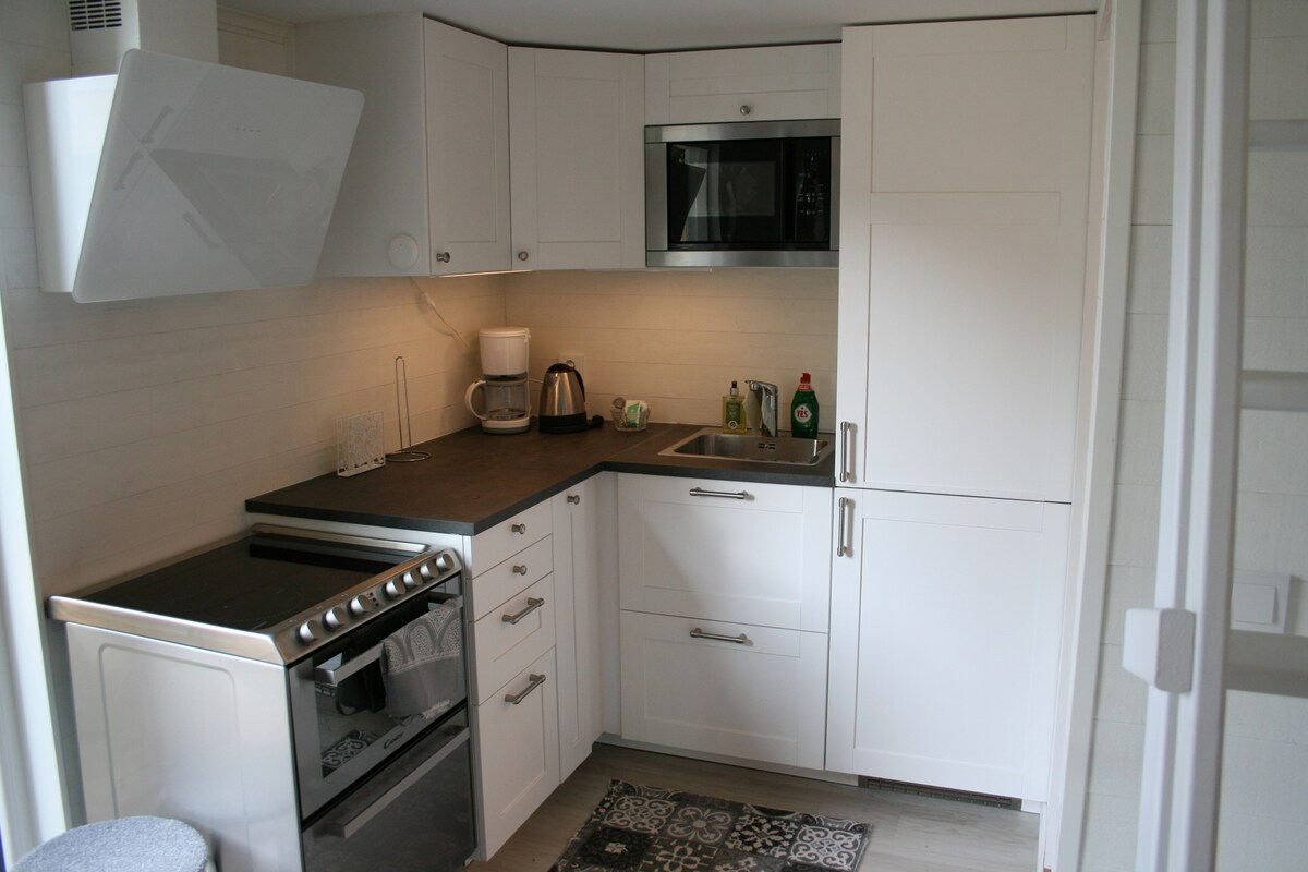 Hytte med kjøkken, kjøleskap, toalett med dusj- og vedovn og sauna. Hvis du vil ha badstue, er det en ekstra kostnad på 50 euro/5 euro. Privat terrasse med utsikt mot innsjøen. 7 km til kjøpesenteret IKEA. Sengetøy og håndklær er inkludert. Kaffe og te på hytta. Frokost inkludert. Vaskerom tilgjengelig i 50 timer/5 €. Skilt er tilgjengelige for biloppstilling.