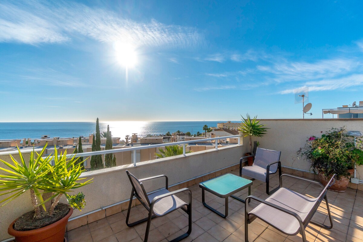 Fantastisk havutsikt. Nyt de vakre strendene i Campoamor som bor på dette loftet med alle fasilitetene. Den har et fullt utstyrt kjøkken, dobbeltseng og sovesofa for 2 pers og 55-tommers smart-TV. En 10. etasje i en urbanisering ligger i en av de beste i Campoamor, siden du har bare 1 min, barer, restauranter og supermarkeder, også en padle/tennis klubb med svømmebasseng og treningsstudio ved foten av bygningen. 5 min gange til stranden.