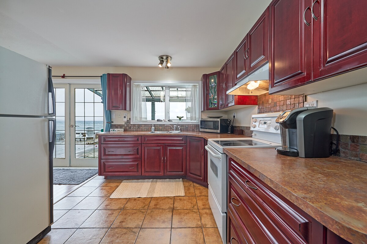 Gå langs havet, lys og privat hytte med to soverom og badstue, med fantastisk utsikt over Georgia-stredet. Dette sjarmerende tilfluktsstedet ved havet har et fullt utstyrt kjøkken med moderne apparater, vaskerom og en luksuriøs spa-lignende walk-in-dusj med småstein. Den koselige stuen er utformet for å gi panoramautsikt over hav og fjell, og lydene fra naturen skaper det perfekte stedet for å slappe av og koble av.
