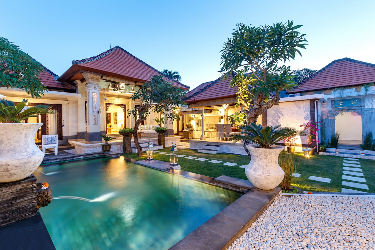 Luksusvilla . Beskrevet av våre gjester som eksepsjonell . På et rolig sted. Med døgnåpen sikkerhet. Gangavstand til butikker ,strand og restauranter , har husholderske daglig lisens til å operere som en korttidsutleie på et sikkert sted, fullt utstyrt utstyr, eget privat basseng. Kan leies som 1, 2 eller 3 soverom Med gratis TRÅDLØST NETTVERK lisens nr. 3000 9298 03 03 for korttidsutleie. Kadek er i villaen daglig og gjør all husholdningen din og ivareta alle dine daglige behov for shopping osv.
