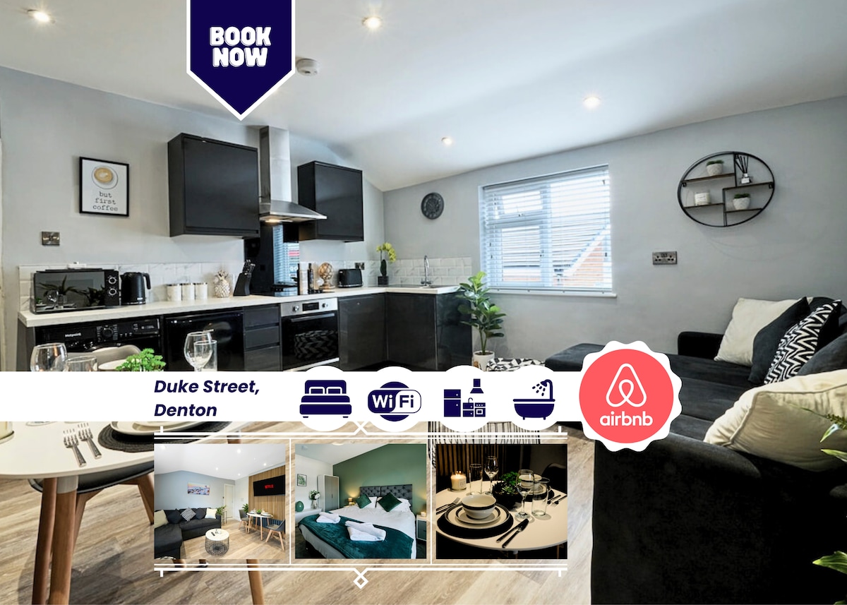 Velkommen til vår koselige og stilige etasjes leilighet med to soverom i sentrum av Denton i Manchester. Denne romslige ferieboligen er perfekt for familier, par eller forretningsreisende, og tilbyr komfort, bekvemmelighet og en ekte hjemmekoselig følelse. To komfortable soverom – slapp av i et vakkert møblert soverom med dobbeltseng og et lyst tomannsrom, ideelt for både voksne og barn. Fullt utstyrt kjøkken – alle nødvendigheter er inkludert. Romslig stue - basisartikler er inkludert.