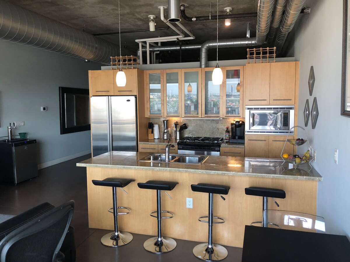 Renovated, modern penthouse loft in a mixed use live/work building with designer touches throughout. The loft sleeps 4 people between the 2 bedrooms with King and Queen Beds. Incredible views of the mountains, downtown, and Mile High Stadium from the huge windows and large private deck. Located two to three miles from downtown in the industrial part of the Historic Baker Neighborhood.