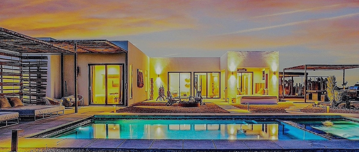 Escape to a secluded 5-acre desert sanctuary where heated pool and spa meet architecture and raw landscape. Designed for privacy and elevated living, 6 miles from Joshua Tree. Private gated estate with sweeping desert views and open desert surroundings in total stillness under vast desert skies. • Pool + spa • Yoga circle + bocce • Fire pit + stargazing • Outdoor dining + pizza oven • Sonos + Tesla charger • Concierge services (chef, massage, sound healings) • Robes + Wonder Valley amenities