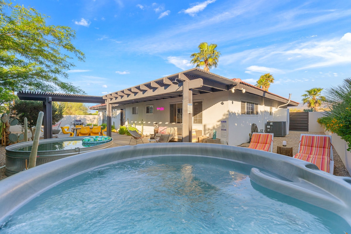 Reis til ditt eget private ørkenferiested, perfekt beliggende i nærheten av Joshua Tree nasjonalpark og Palm Springs. Dette stilige og avslappende hjemmet er den ideelle blandingen av komfort, privatliv og fantastisk utsikt over ørkenen, perfekt for par, familier eller venner som ønsker å slappe av. Tilbring dagene med å slappe av ved det private bassenget og avslutt kveldene med å nyte spaet under en himmel full av stjerner. Enten du er her for eventyr, avslapning eller en helg, setter dette hjemmet stemningen for et uforglemmelig opphold.