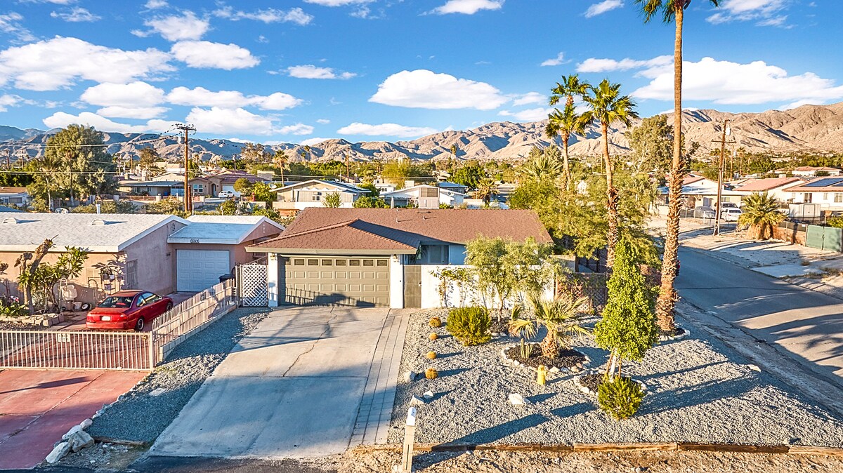 Welcome to the Mountain View Retreat in Desert Hot Springs where you can enjoy beautiful panoramic mountain views from the backyard, bask in the sun while in a saltwater pool/hot tub, enjoy playing outdoor games and watch your favorite movie on an inflatable projector screen. This 3 bed 2 bath house with open concept living room/kitchen/dining room is a great place to relax after golfing 18 holes at a nearby golf course or for a weekend getaway with family or friends.