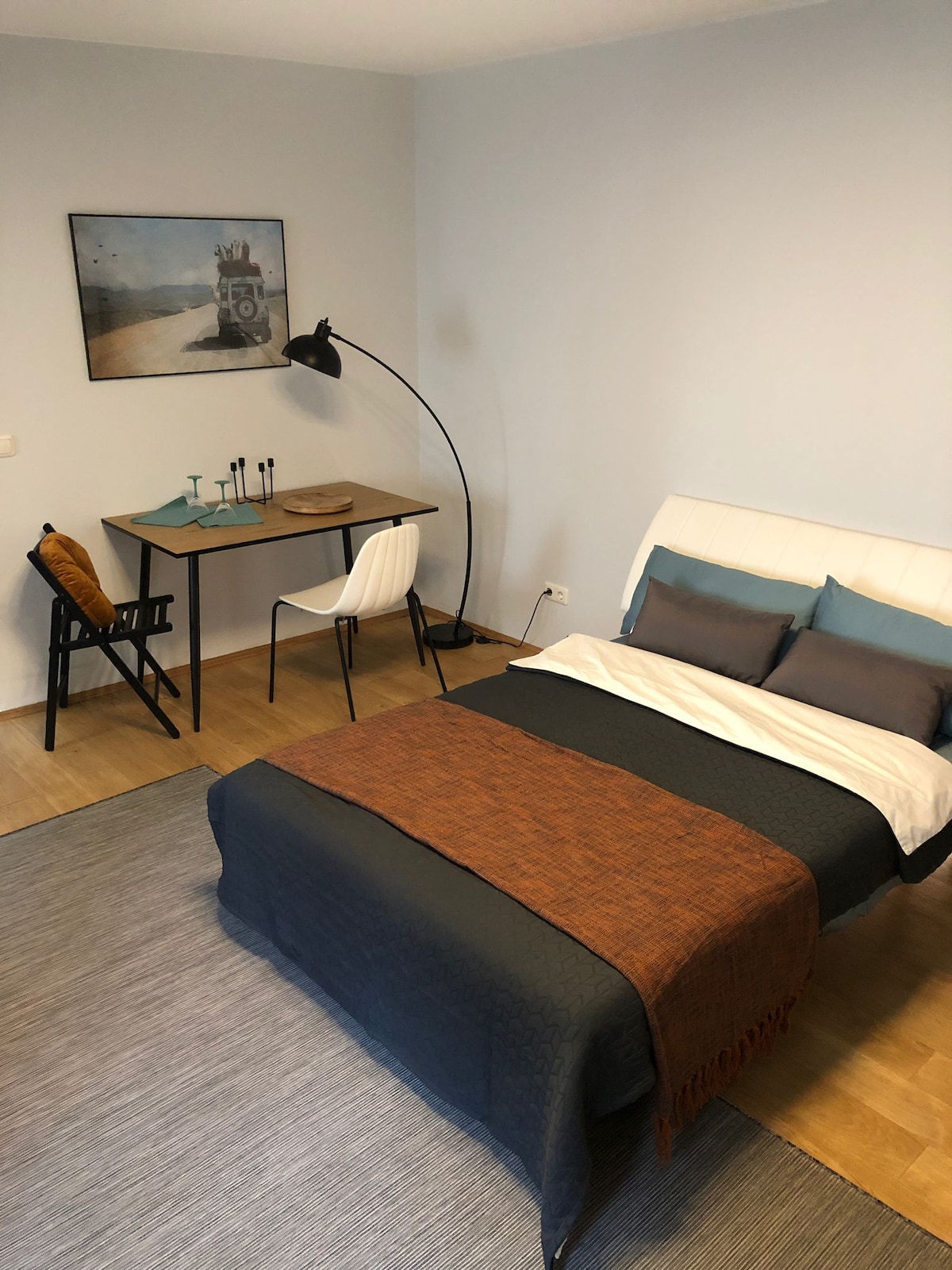 Det 16 kvadratmeter store rommet med bad ligger i Haidhausen, et livlig, kreativt kvarter i sentrum av München. Supermarkeder, barer og restauranter ligger noen meter unna. Du er i første etasje med egen inngang. Når du kommer inn i rommet, ser du det lyse badet med dusj og toalett foran deg, og et hjørne med servise, vannkoker og kjøleskap. Studioet har ikke kjøkken. Til venstre er det høyt tak, et høykvalitets tregulv og store vinduer, samt et skrivebord og en ny, ekte seng.