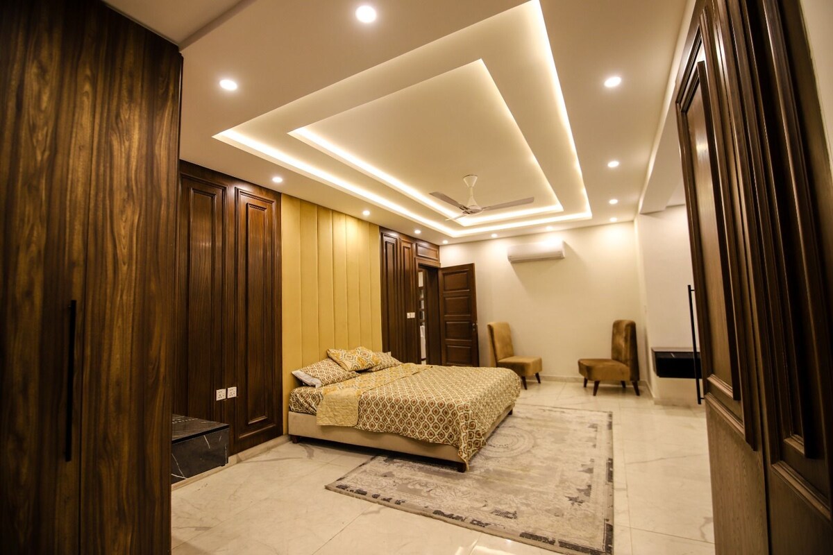 Stort gårdshus bygget på fem kanaler (2500 kvm). Venstre side av et toetasjes gårdshus tilgjengelig for 10-15 personer. Huset ligger i et fredelig og grønt område i Islamabad Gulberg Greens. Helt nytt hus med moderne design, moderne møbler og interiørdesign. I nærheten: • 2 minutter: tur-/joggeområde. • 3 minutter: treningsstudio, kafé/restauranter, minibank, moské, apotek, supermarked. • 5 minutter: T-bane. Funksjoner: • To lounger og en barnesalong. • Ekstra matlagingskjøkken og et vaskerom.
