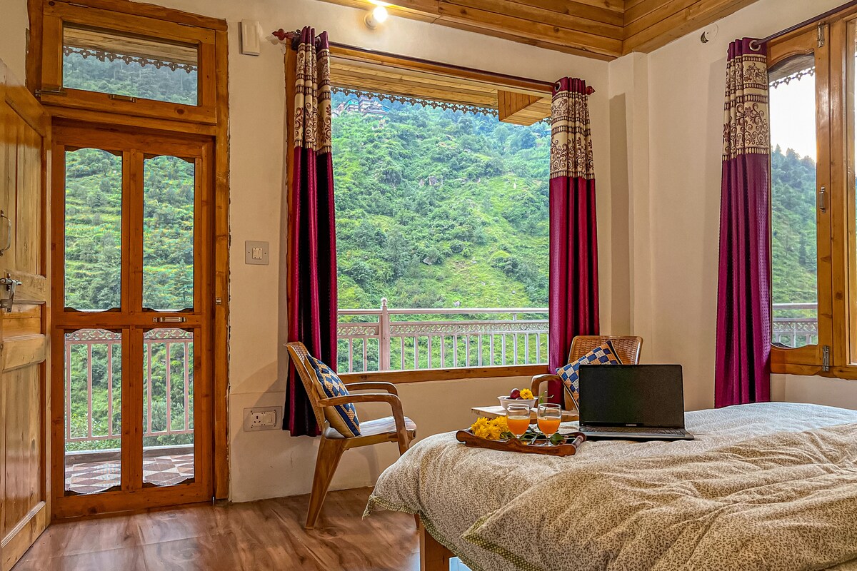 Eksklusivt fullt utkjøp av eiendom: bestill tre rom med bad (øverste etasje) med den koselige duften av devdar-tre, privat lobby og frukthage med 180° utsikt over elven + vaktmestertjeneste eksklusivt for gruppen din. Tilgang fra veien med gratis parkering. Funksjoner: Trådløst nettverk med høy hastighet, kjæledyrvennlig frukthage, bål og førerrom. Utforsk: 📍 2 km: GHNP-porten (UNESCO) 📍2,3 km: fottur til Choie-fossen 📍11 km: Bathad-fossen 📍12 km: Sarchi Meadows 📍 2 minutters gange: Tirthan-elven Opplev autentisk Himachali-varme.